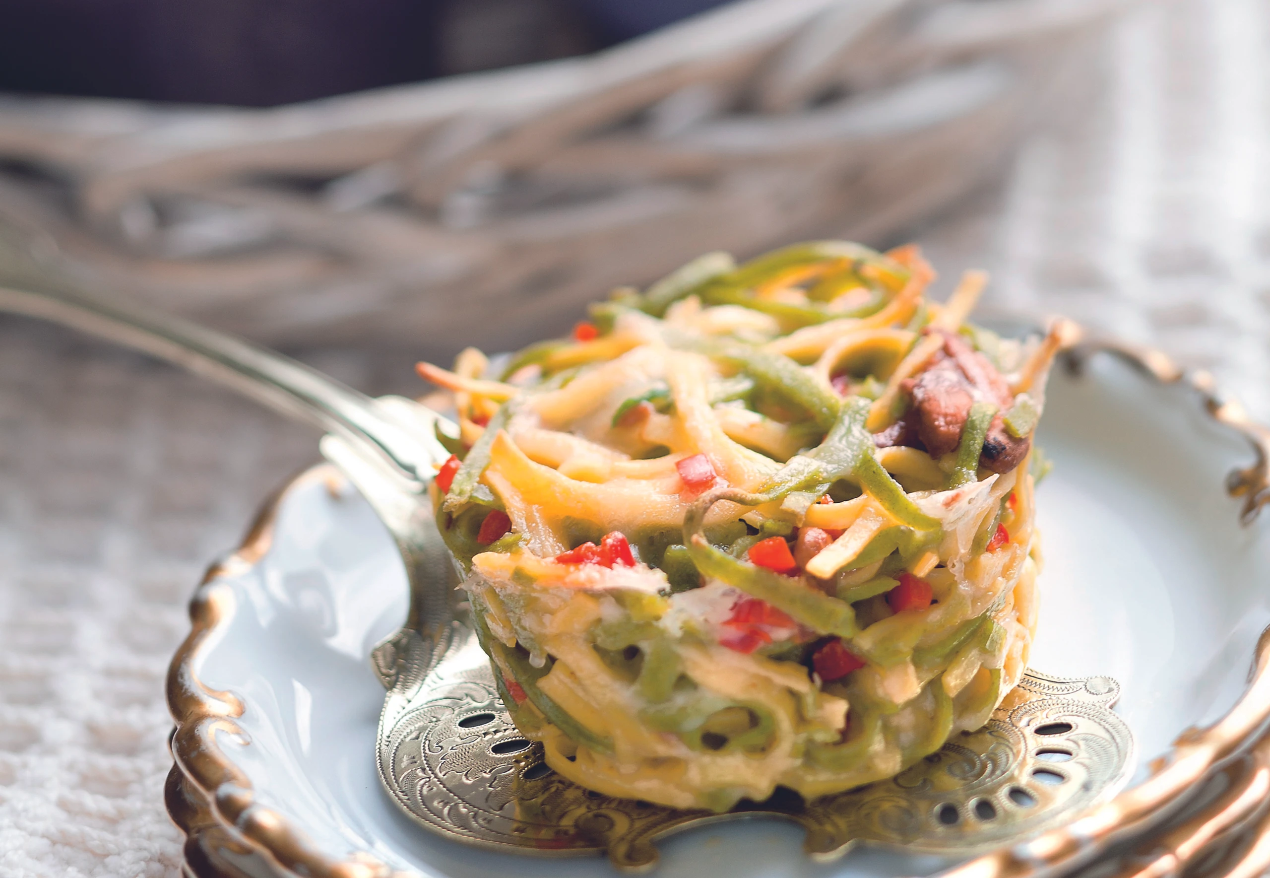 Rohr auf 180°C vorheizen. 4 Auflaufförmchen (Inhalt ca. 250 ml) mit Butter ausstreichen. Bandnudeln in reichlich Salzwasser bissfest kochen, abseihen, abschrecken und gut abtropfen lassen.
