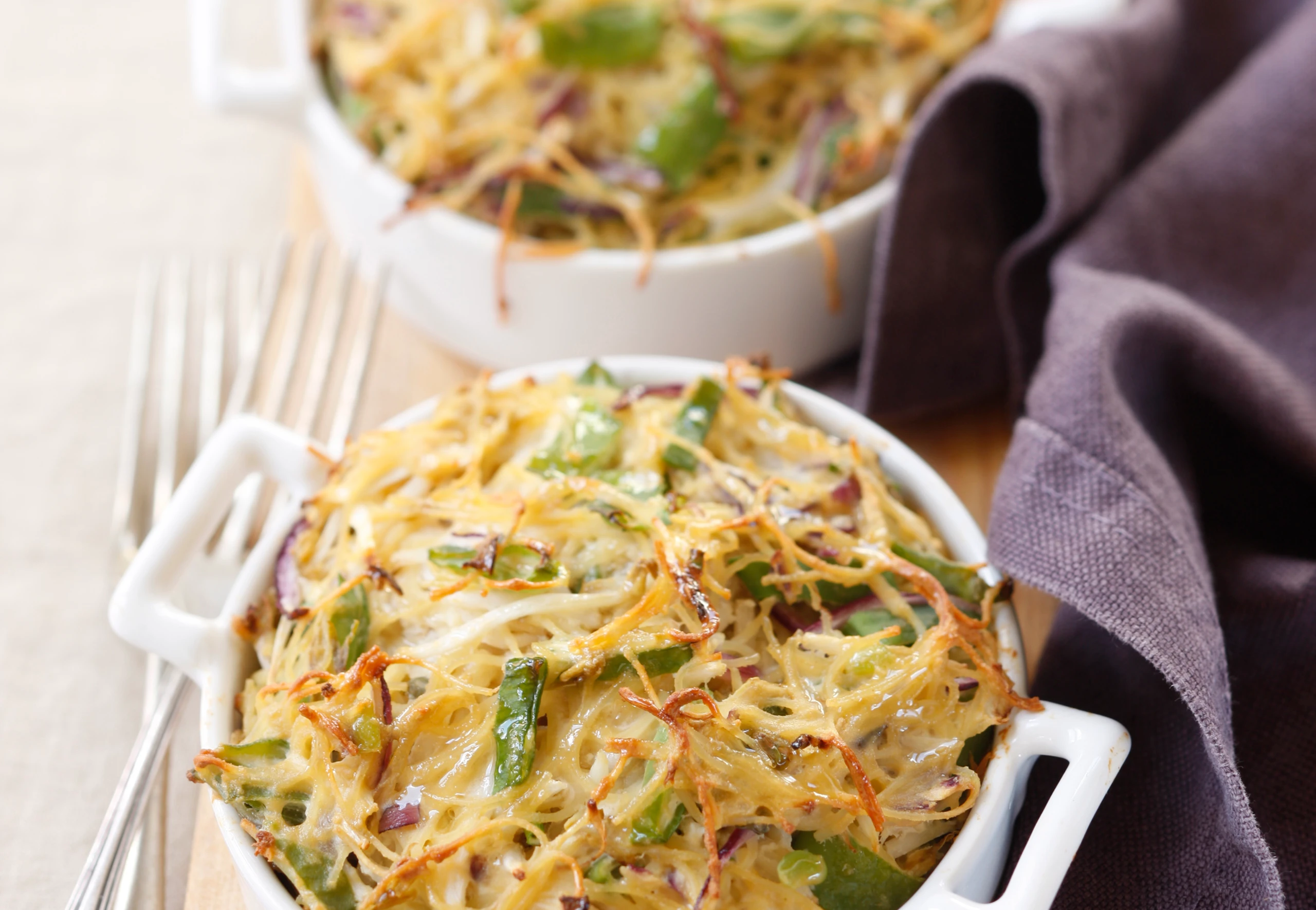Rohr auf 220°C vorheizen. 2 Auflaufförmchen (Inhalt je 300 ml) mit Öl ausstreichen.