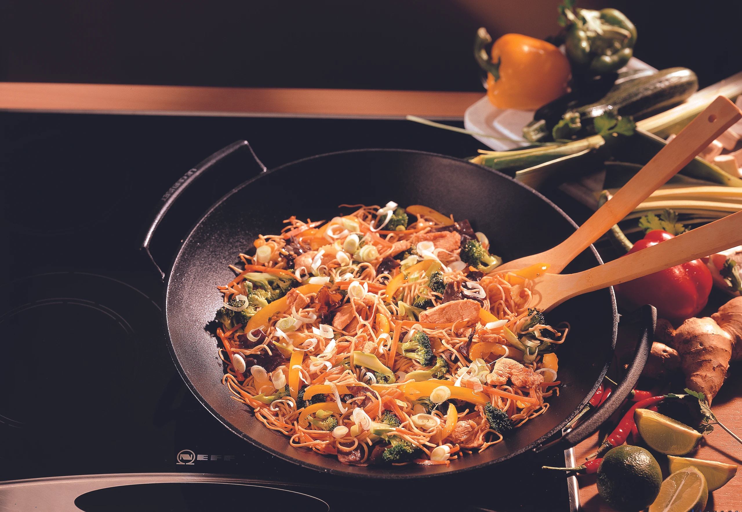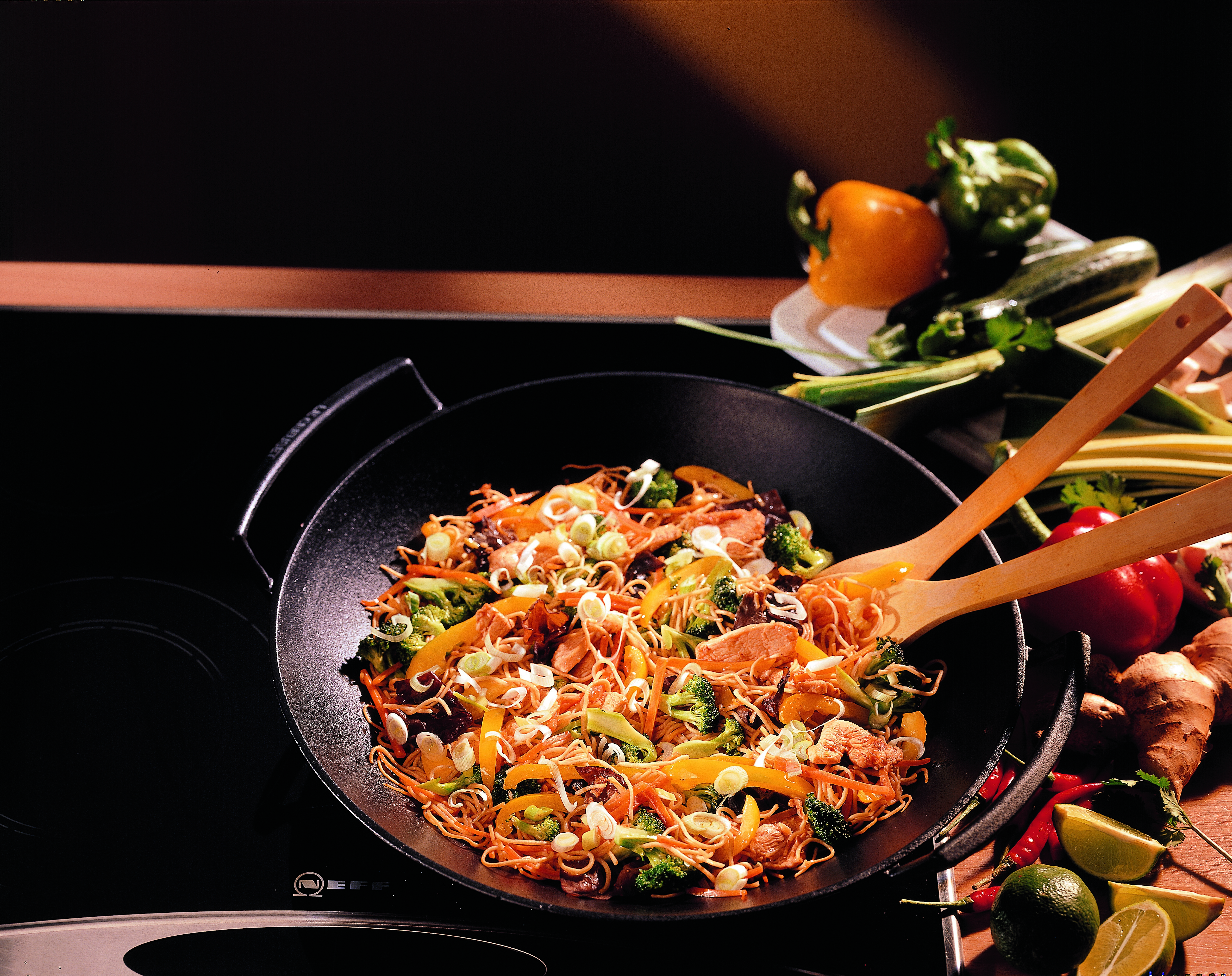Wok säubern und trocknen. Nudeln in reichlich Salzwasser al dente kochen. Inzwischen etwas Öl im Wok erhitzen. Fein gehackten Ingwer, Knoblauch, Karotten, Brokkoli und Paprika zufügen, leicht salzen, unter Rühren 3 Minuten braten. Sellerie und Pilze zugeben und unter Rühren 1 Minute mitbraten. Mit Suppe und etwas Sojasauce aufgießen, mit Chili würzen. Zugedeckt 3 Minuten dünsten. Nudeln abgießen, gut abtropfen lassen.