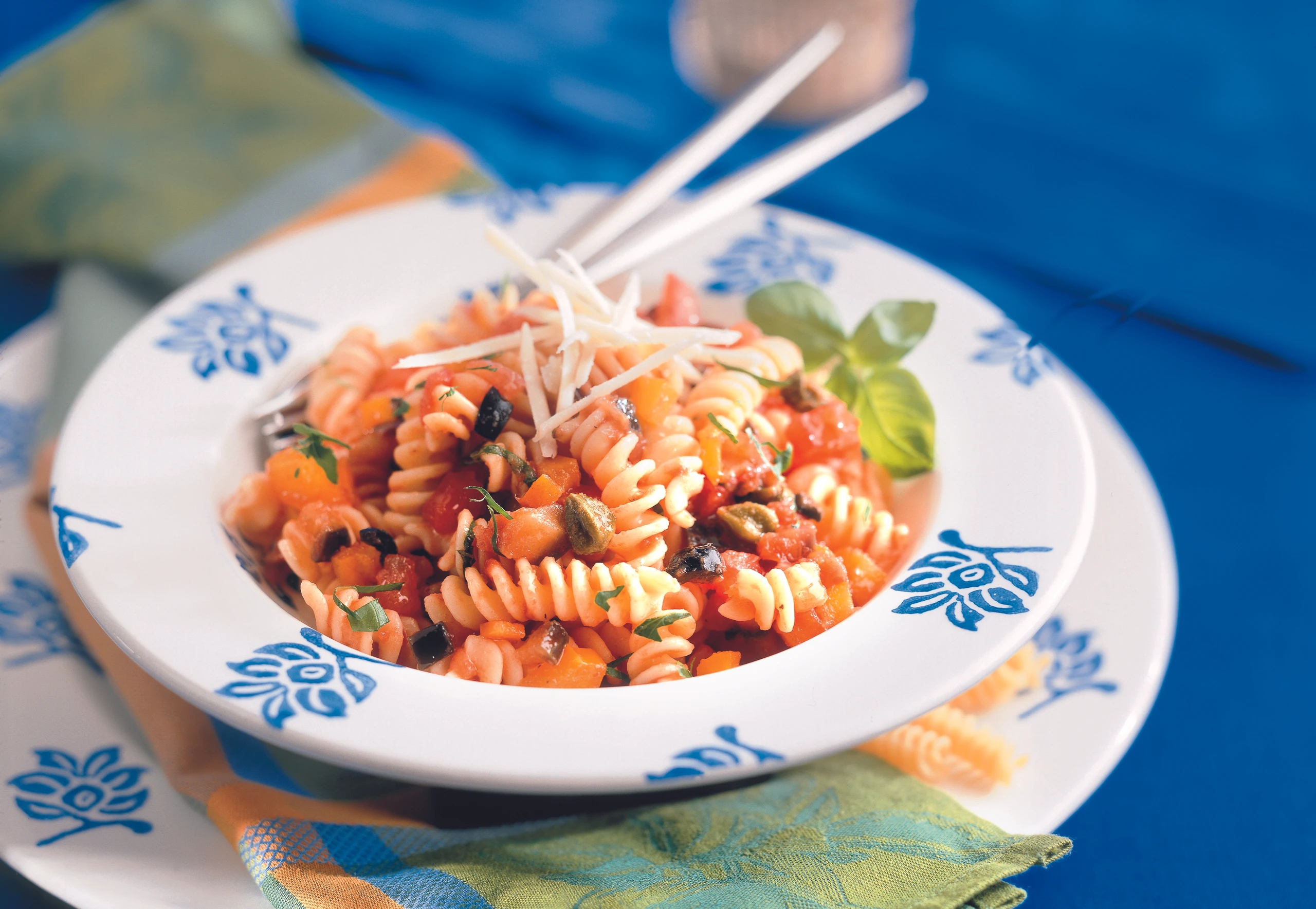 Melanzani und Knoblauch in 4 EL vom Olivenöl anschwitzen, Sardellen, Paradeiser und passierte Paradeis-Innereien zugeben. Mit Salz, Pfeffer und Oregano würzen und zugedeckt ca. 12 Minuten bei mittlerer Hitze dünsten. Paprika, Oliven und Kapern in die Sauce mischen und ca. 10 Minuten offen weiterköcheln – falls nötig, wenig Suppe zugießen.