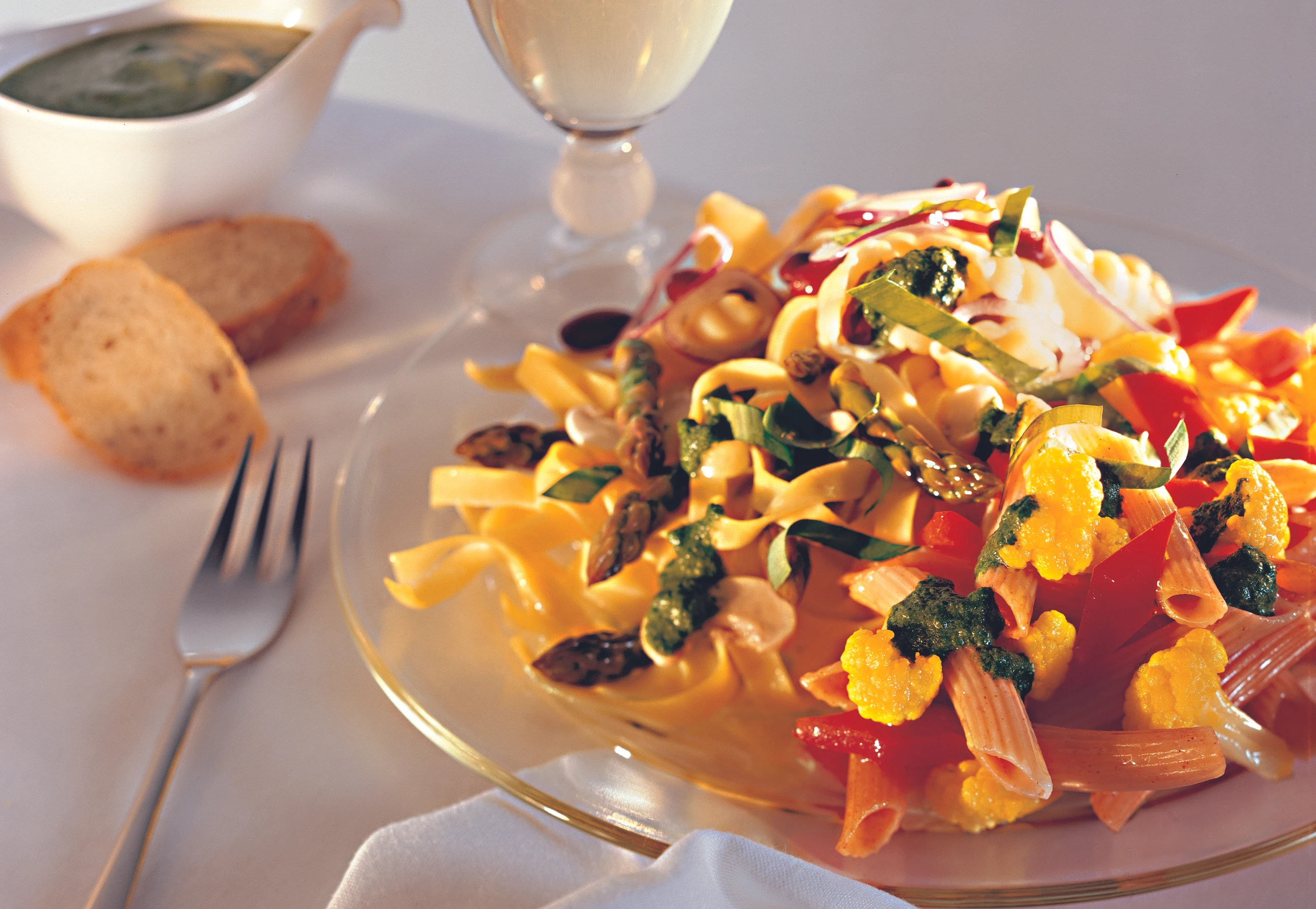 Teigwaren und Gemüse in eine Schüssel geben, behutsam mit dem Pesto vermischen und eventuell nachwürzen.