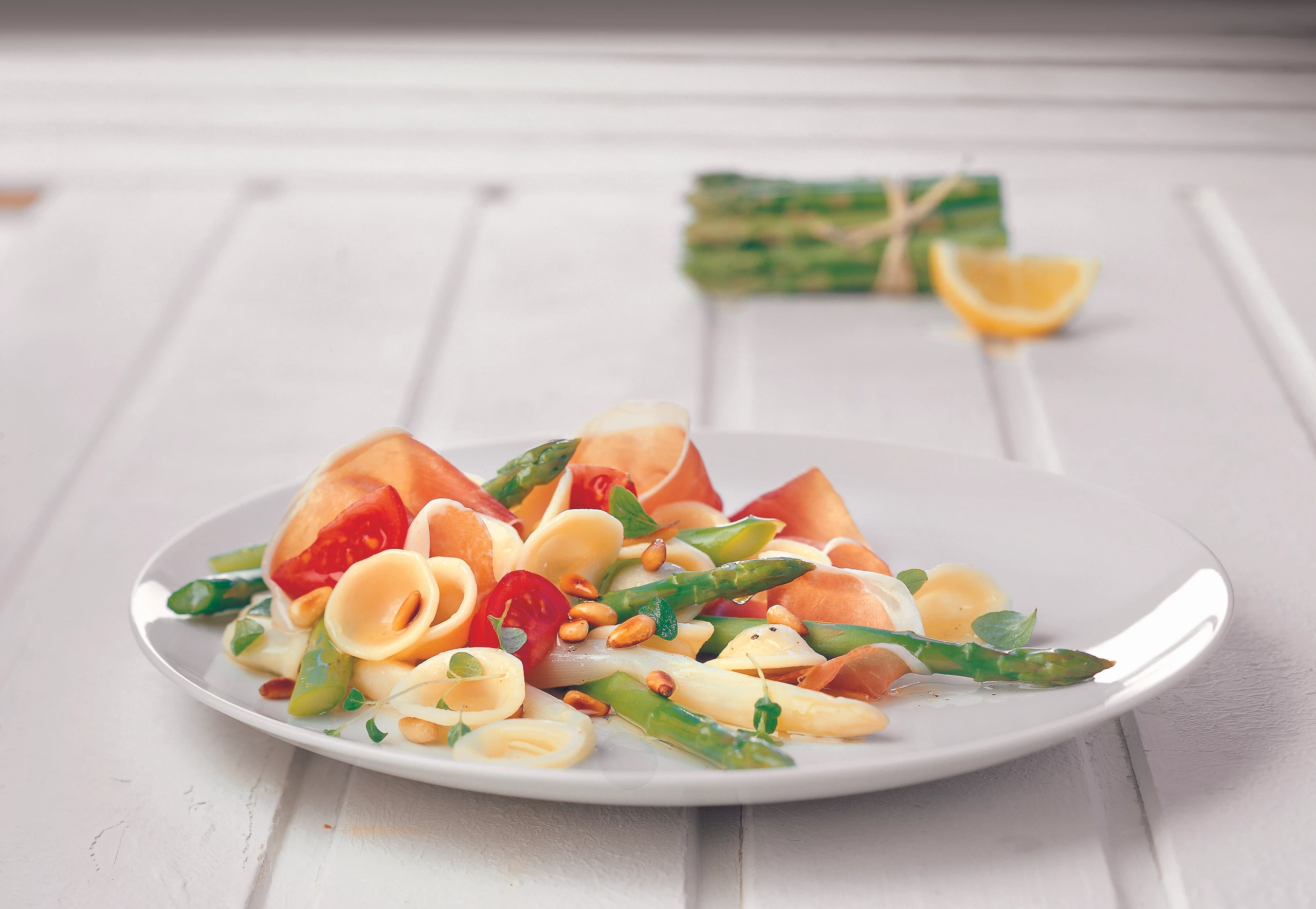 - Reichlich Salzwasser zum Kochen bringen, Knoblauchzehe zugeben und die Orecchiette „al dente“ kochen. Orecchiette kurz abtropfen lassen und noch heiß mit der Vinaigrette und dem Spargel vermengen. Den Salat 10–15 Minuten ziehen lassen.