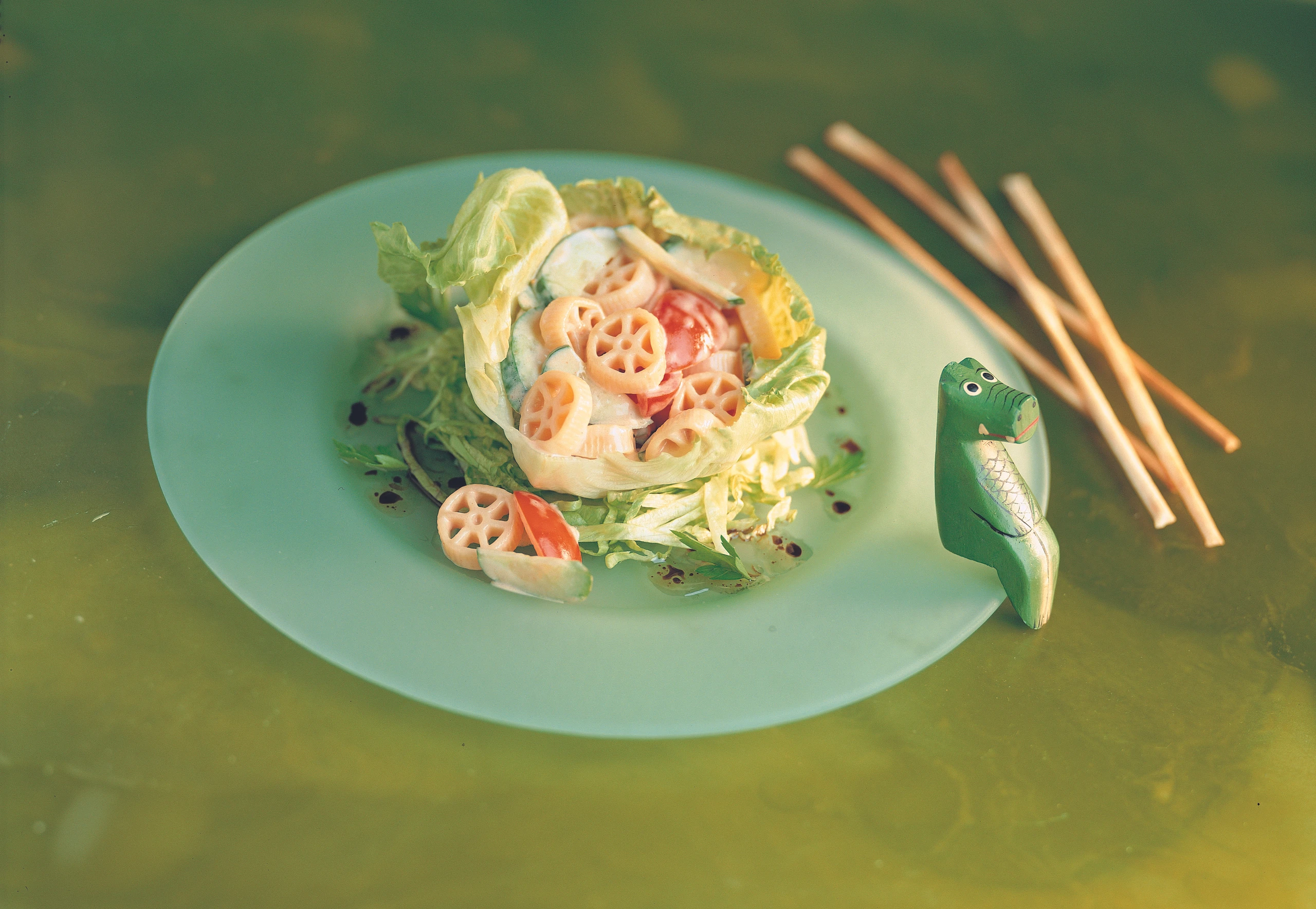 Essig mit wenig Salz und Öl verrühren. Salatstreifen in der Marinade wenden und auf Tellern anrichten, je ein Salatblatt darauf legen, den Nudelsalat darin anrichten. Den Salat kann man zusätzlich mit frischen Kräutern wie Petersilie, Schnittlauch oder Basilikum garnieren.