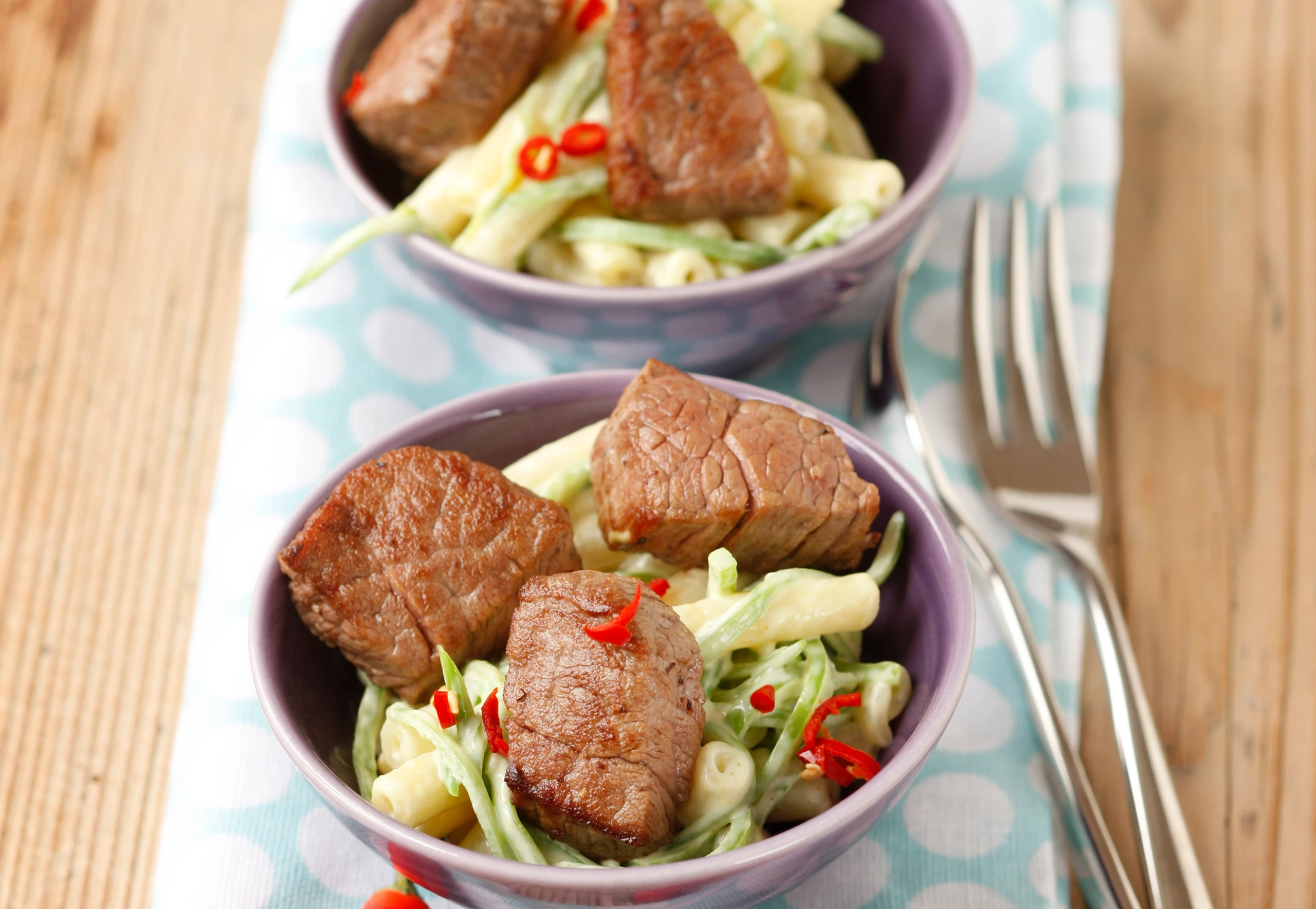 Mayonnaise mit Sauerrahm und Curry glatt rühren, mit Salz und Pfeffer abschmecken. Nudeln, Zuckerschoten und Chilis untermischen.