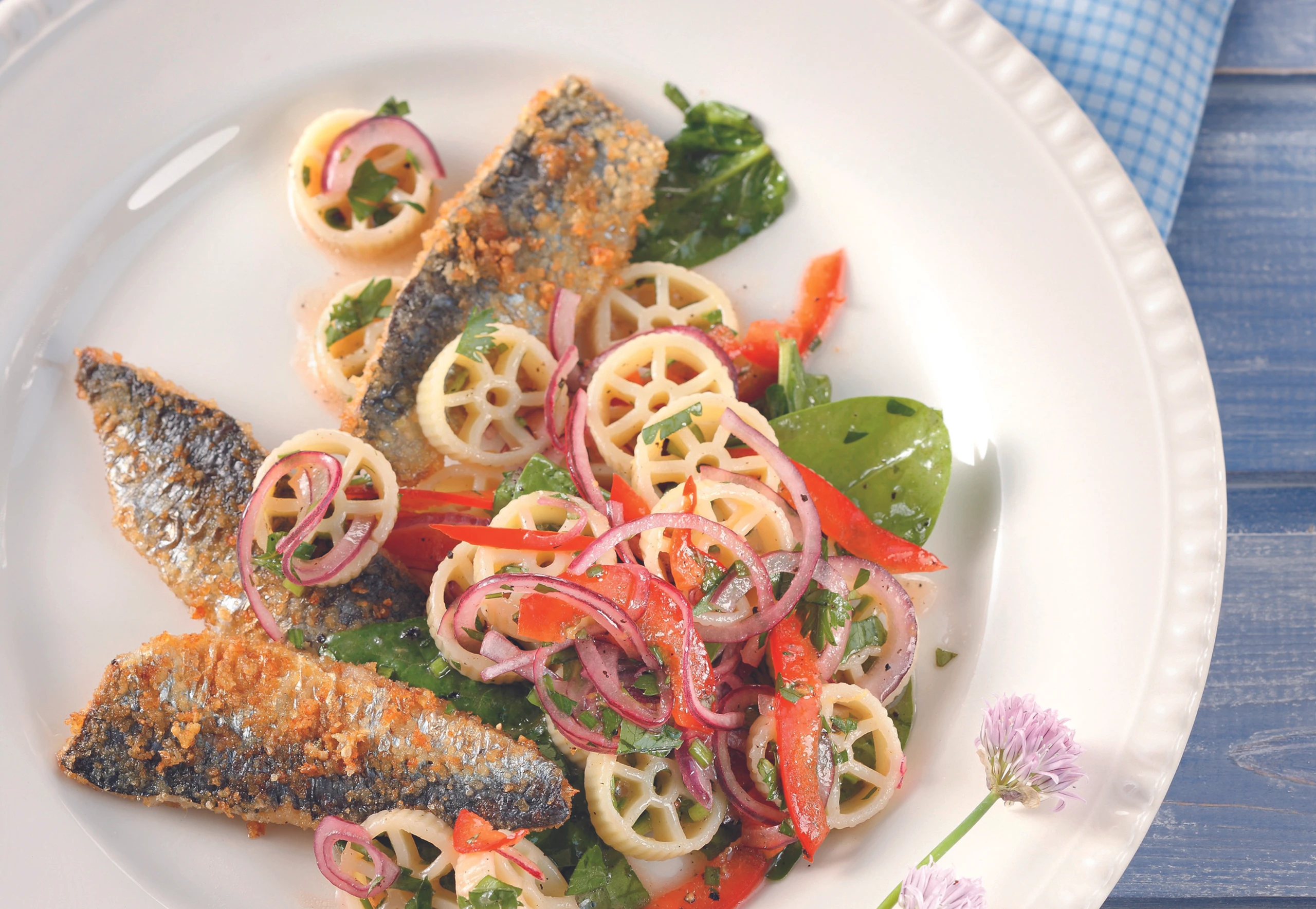 - Sardinenfilets mit zerdrücktem Knoblauch einreiben, in den Bröseln wenden und in Olivenöl 1 Minute beidseitig braten. Sardinen auf dem Nudelsalat anrichten.