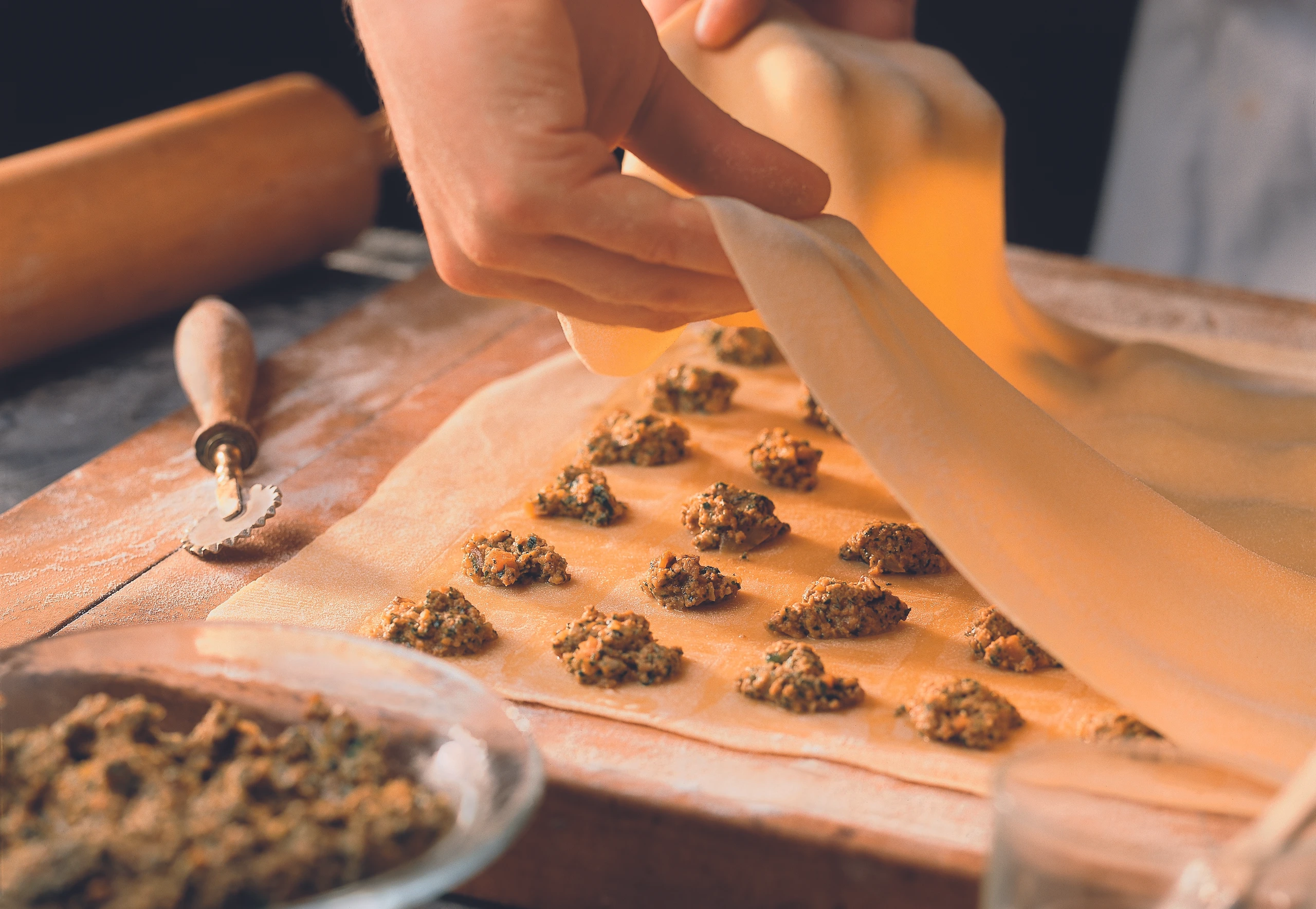 Die Zutaten in der Mulde verrühren, nach und nach mit dem Mehl vermengen. Mit den Handballen so lange kräftig kneten, bis ein seidig glatter Teig entsteht (mindestens 10 Minuten), dabei das Teigstück immer wieder um 180 Grad drehen. Teig in Frischhaltefolie wickeln und ca. 20 Minuten bei Zimmertemperatur rasten lassen.