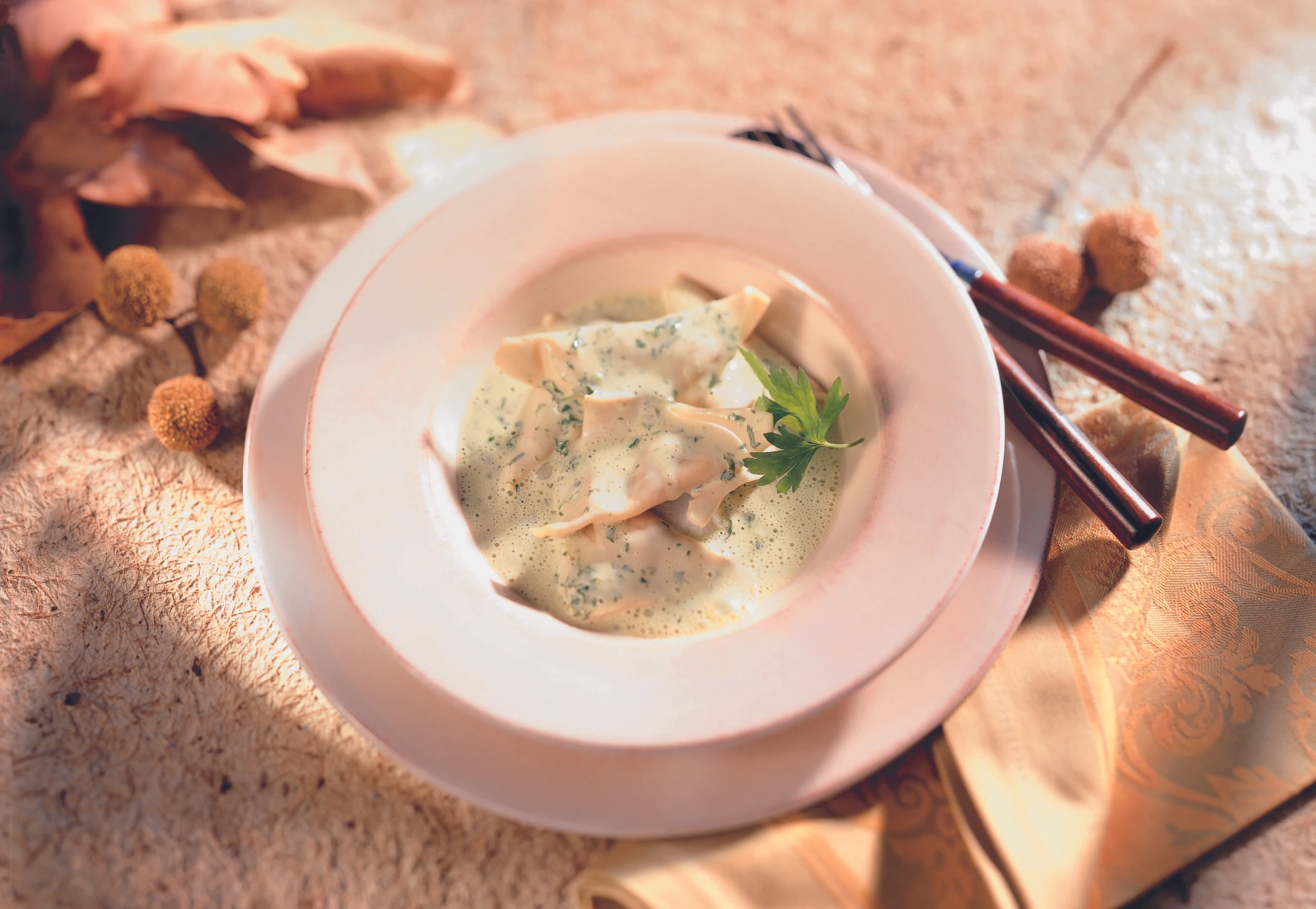 Vor dem Anrichten Petersil in die Sauce rühren, Sauce mit einem Stabmixer aufschlagen. Tascherln abtropfen lassen, mit der Sauce anrichten und rasch servieren.