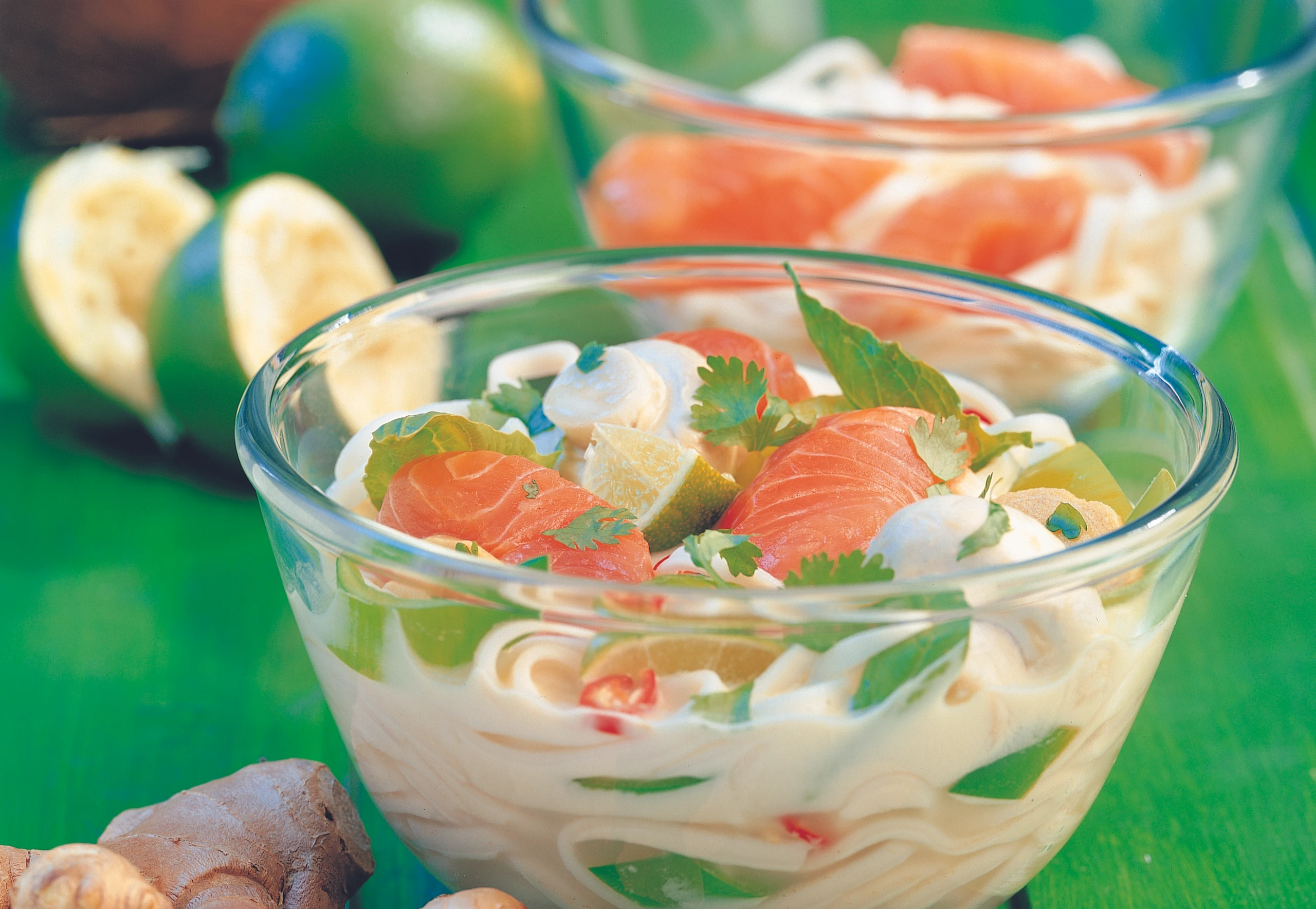 Lauch in die Suppe rühren und ca. 3 Minuten köcheln. Suppe vom Herd nehmen. Spinat unterrühren. Suppe mit Salz und wenig Limettensaft abschmecken. Nudeln in großen Suppenschalen verteilen, Lachs darauflegen und die Kokossuppe darübergießen. Suppe mit Limettenscheiben und Koriander garniert servieren.