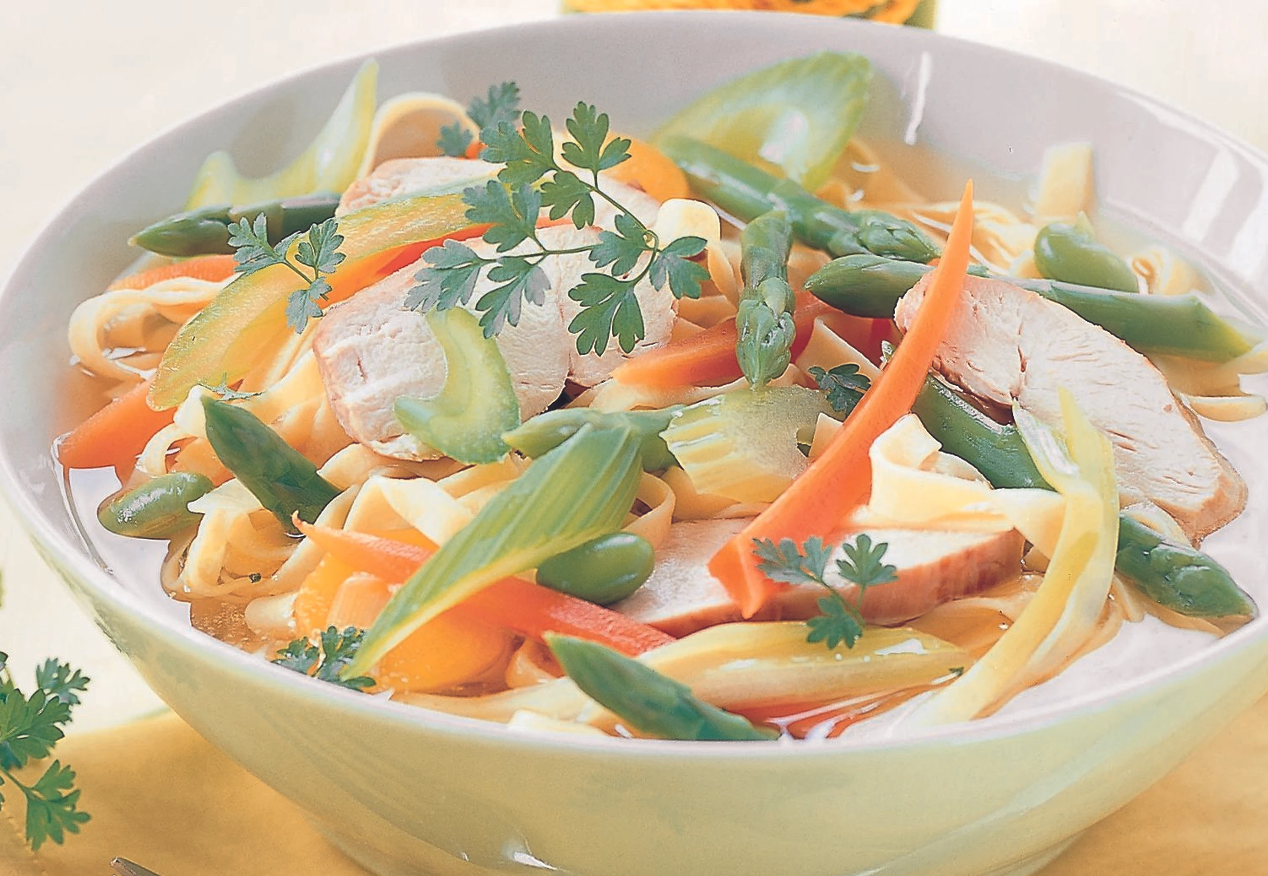 Die Nudeln in großen Schüsseln verteilen. Gemüse und Hühnerfleisch darauf geben. Mit Suppe auffüllen.