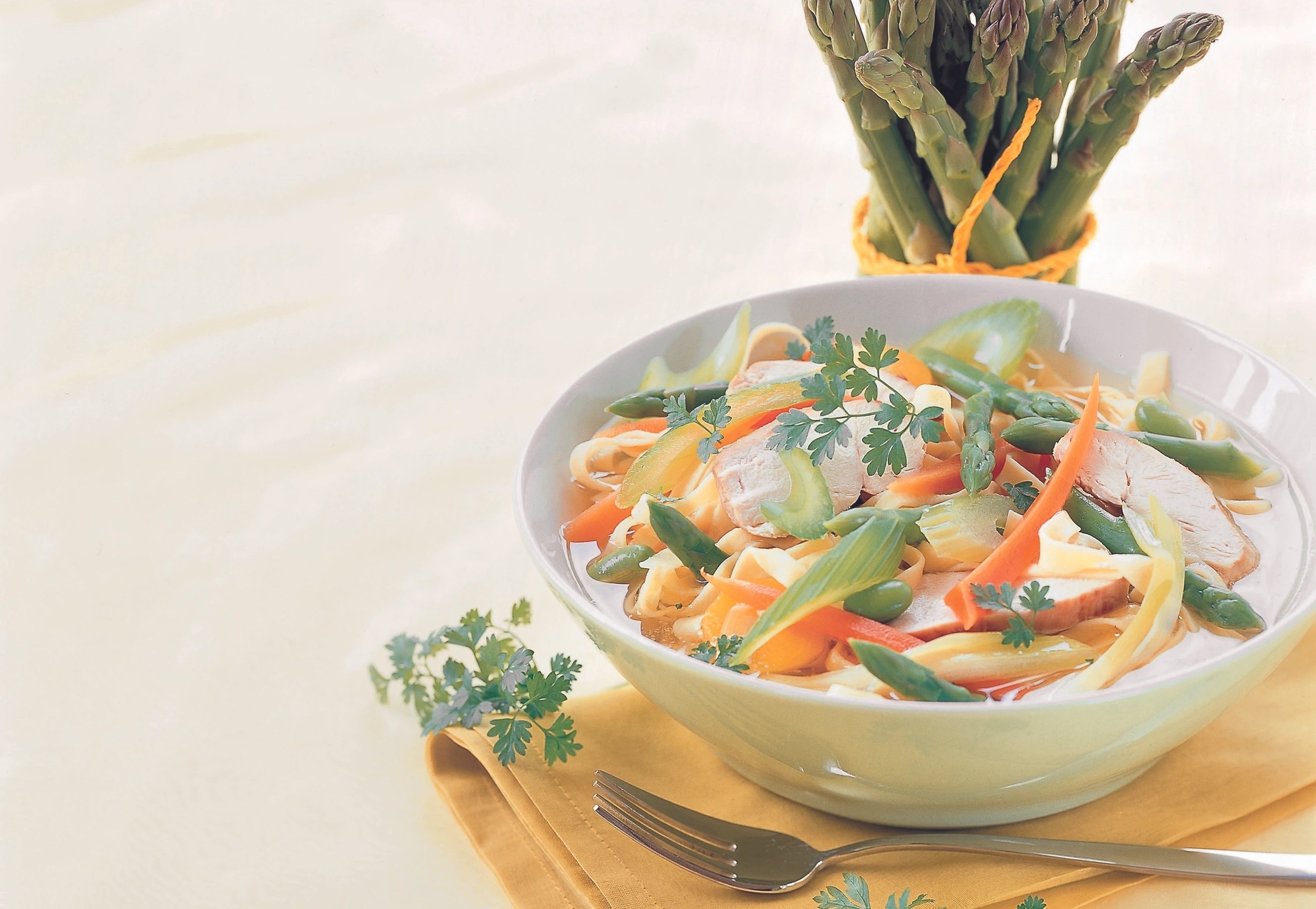 In einem beschichteten Topf etwas Öl erhitzen, Fleisch darin beidseitig anbraten, Zwiebel zugeben und kurz anbraten. Suppe zugießen, mit Lorbeer und Piment würzen. Zugedeckt ca. 15 Minuten köcheln. Karotte, Sellerie, Lauch und Spargel zugeben und ca. 7 Minuten kochen (das Gemüse soll noch einen leichten Biss haben).