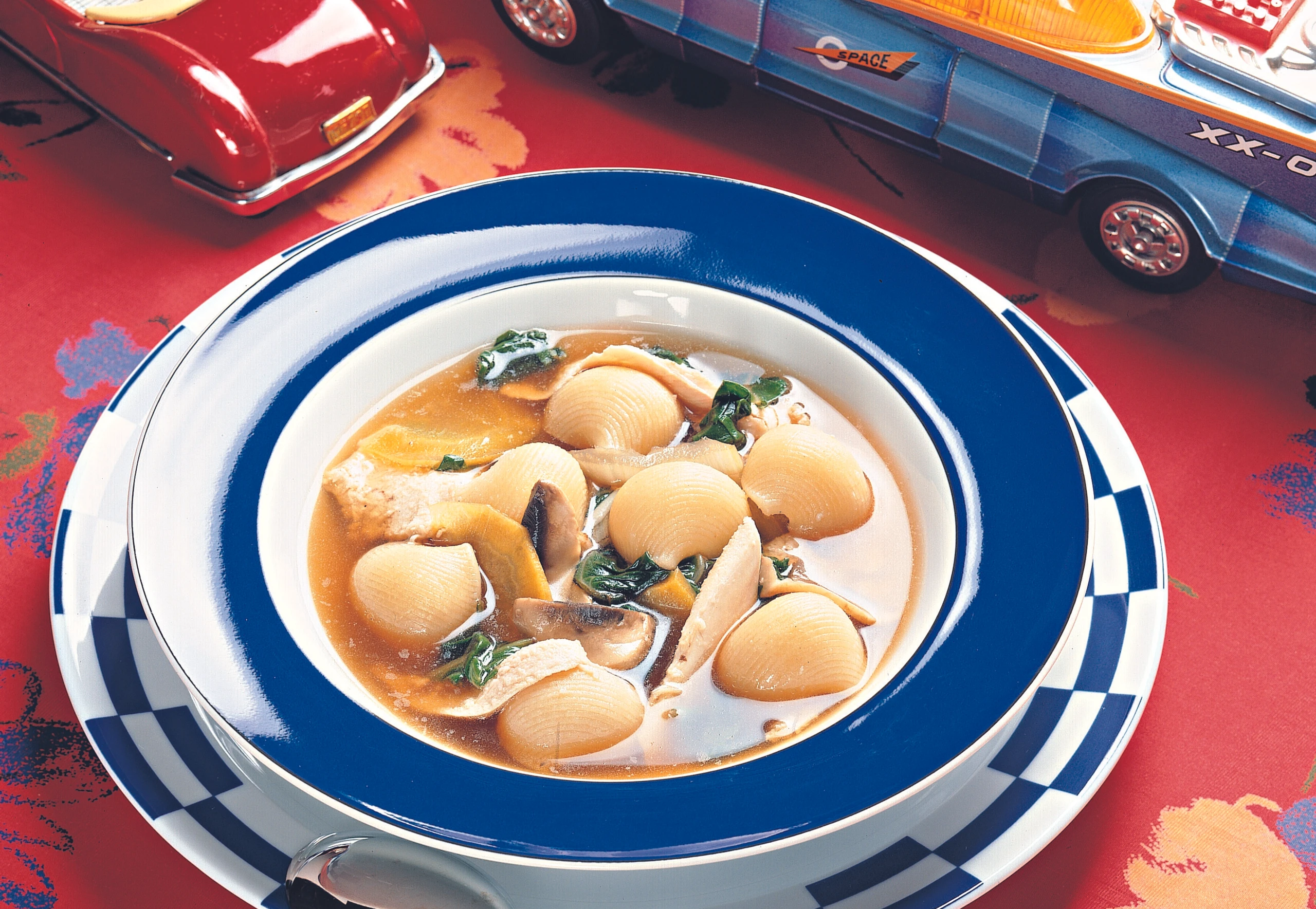 - Teigmuscheln in die Suppe geben und darin erwärmen. Nudeltopf mit Curry, abgeriebener Muskatnuß und Salz abschmecken und anrichten.
