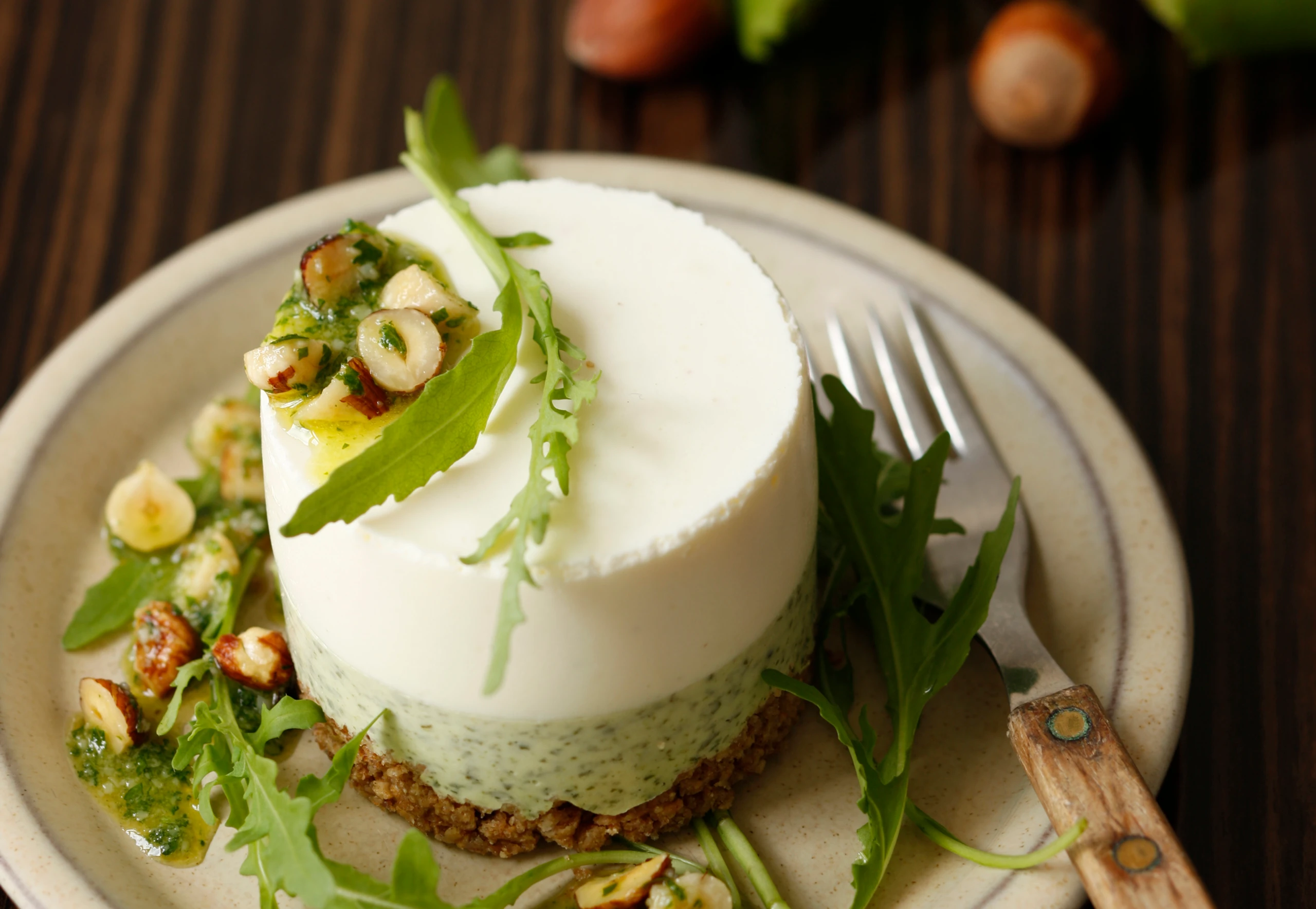Rucolacreme auf dem Nussboden verteilen, Törtchen für 30 Minuten kühl stellen. Übrige Creme darauf verteilen. Törtchen mit Frischhaltefolie zudecken und für 5 Stunden kühl stellen.