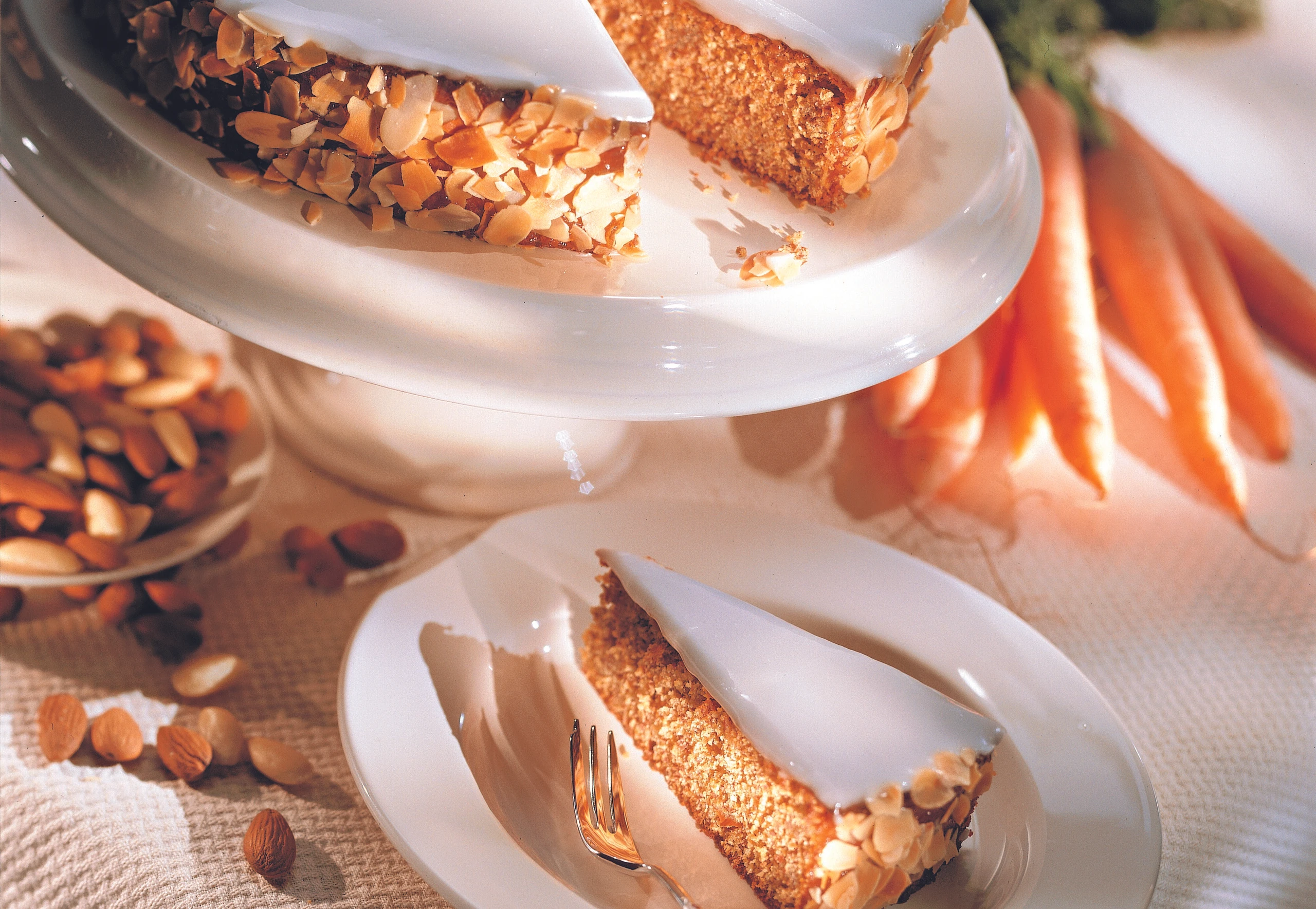 Die Hälfte vom Schnee, Nüsse, Karotten und die zerlassene Butter in den Dotterabtrieb rühren, restlichen Schnee unterheben. Masse in die vorbereitete Form füllen und gleichmäßig verstreichen. Torte ca. 50 Minuten im vorgeheizten Rohr (mittlere Schiene / Gitterrost) backen.