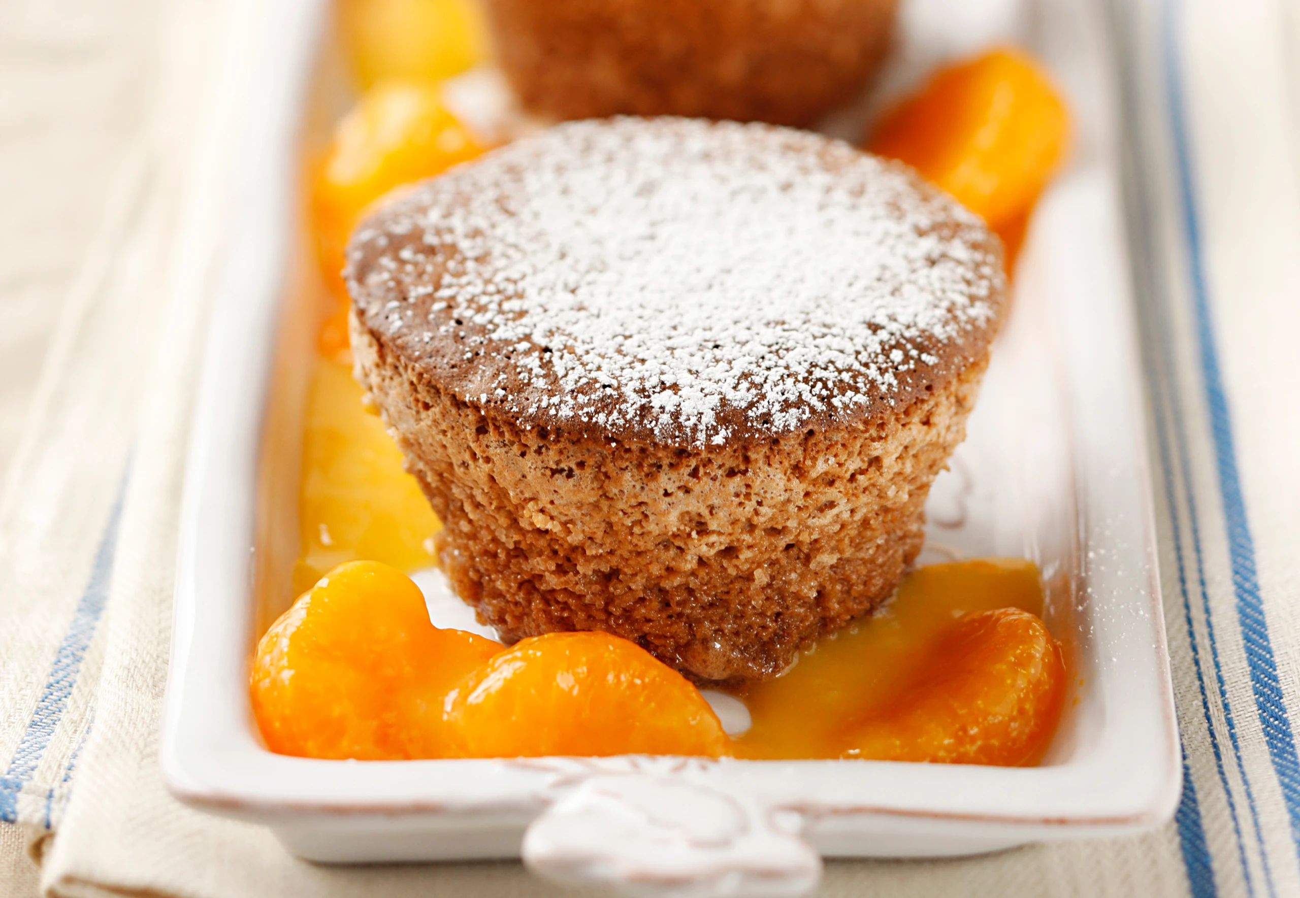 Puddings in den Förmchen kurz rasten lassen, auf Teller stürzen und mit Staubzucker bestreut servieren. Dazu passt Mandarinenkompott.