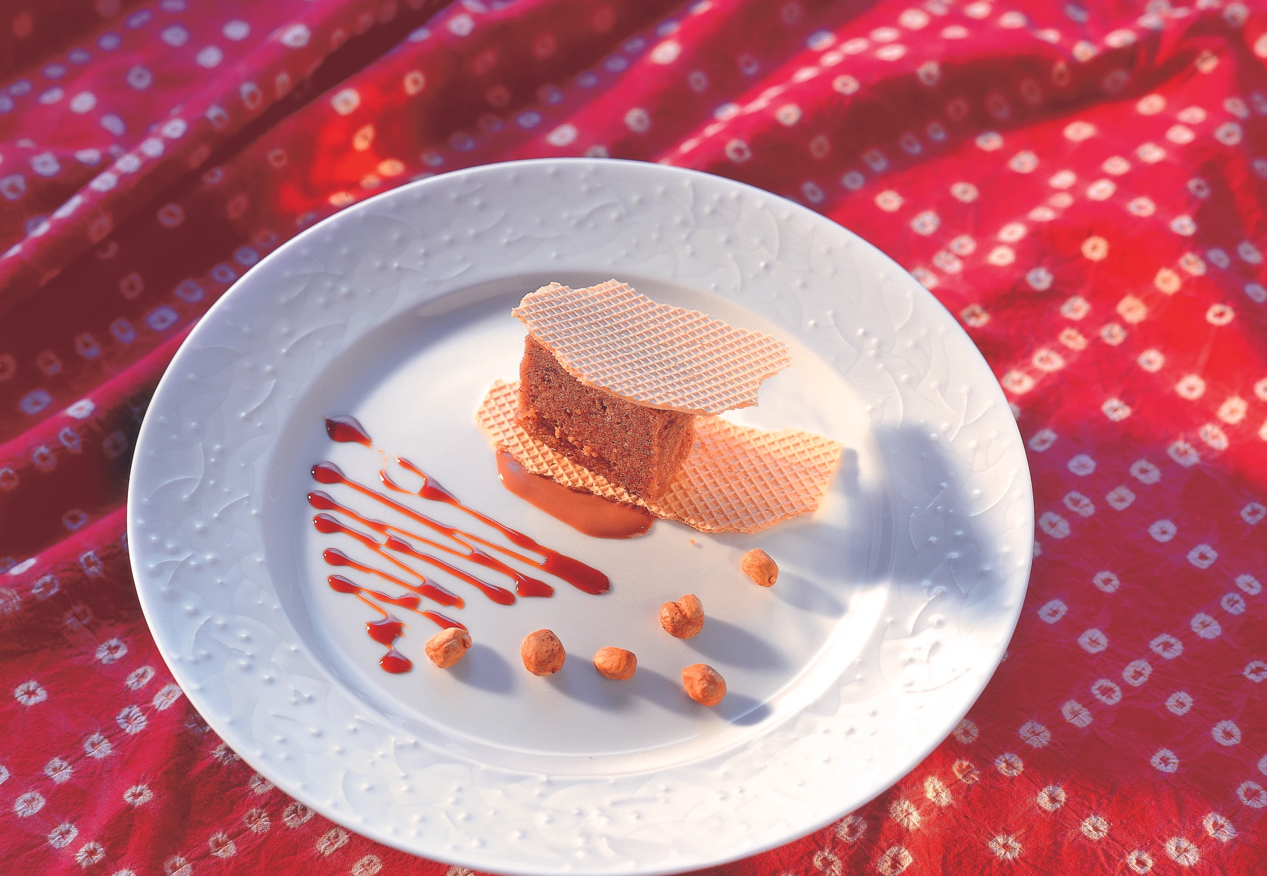 Sauce auf vorgewärmten Tellern verteilen. Waffelblätter in 8 unregelmäßige Stücke brechen. Auflauf aus der Form stürzen, quer in 4 gleich große Stücke schneiden, jede Portion zwischen 2 Waffelstücken auf der Sauce anrichten. Aufläufe mit Karamellsauce (siehe Rezept) und Haselnüssen garnieren.