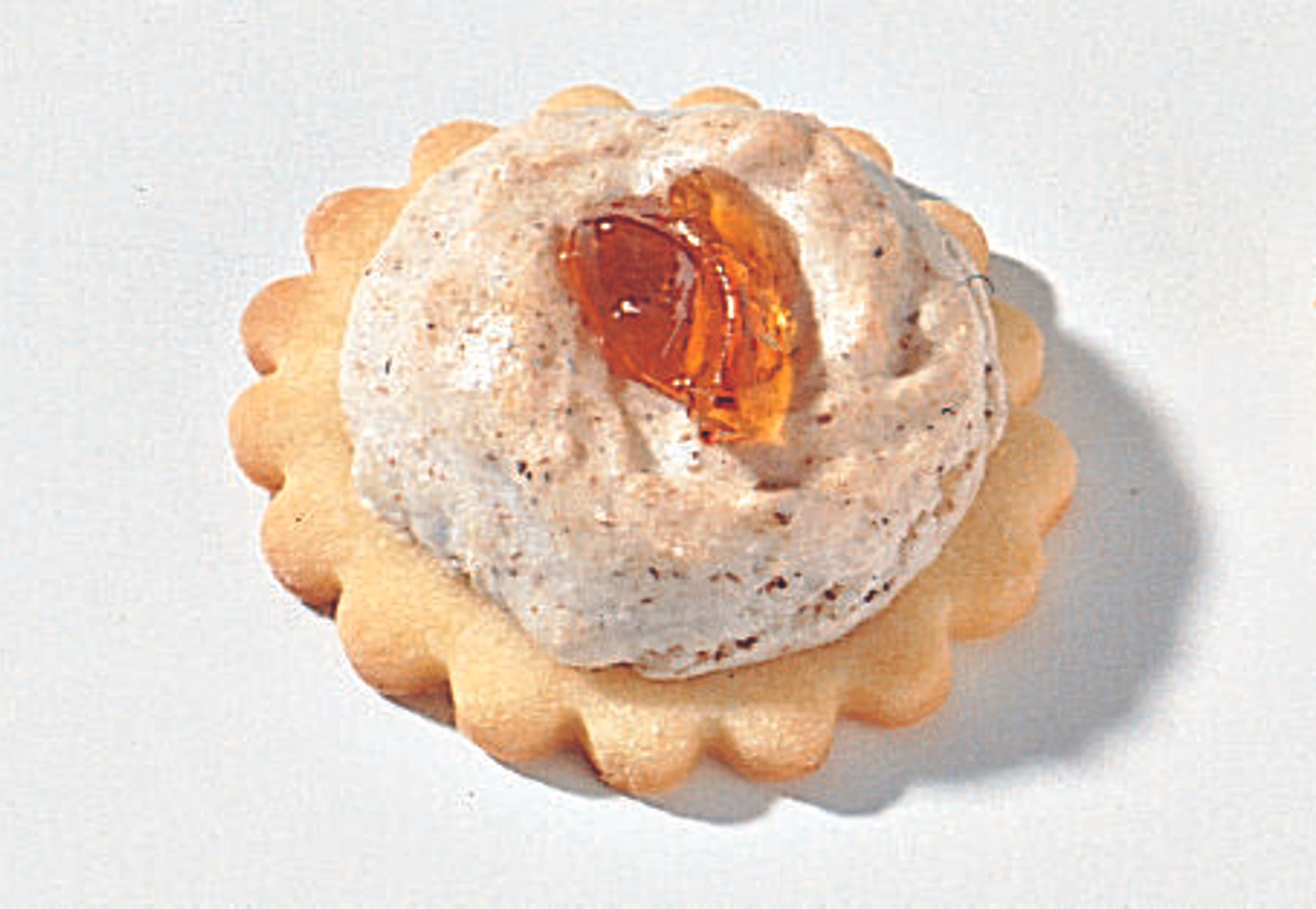 Auf jede Teigscheibe einen Tupfer Nussmasse dressieren und die Kekse im vorgeheizten Backrohr ca. 15 Minuten backen. Kekse aus dem Rohr nehmen, auskühlen lassen. Mit Marmelade oder Quittengelee garnieren.