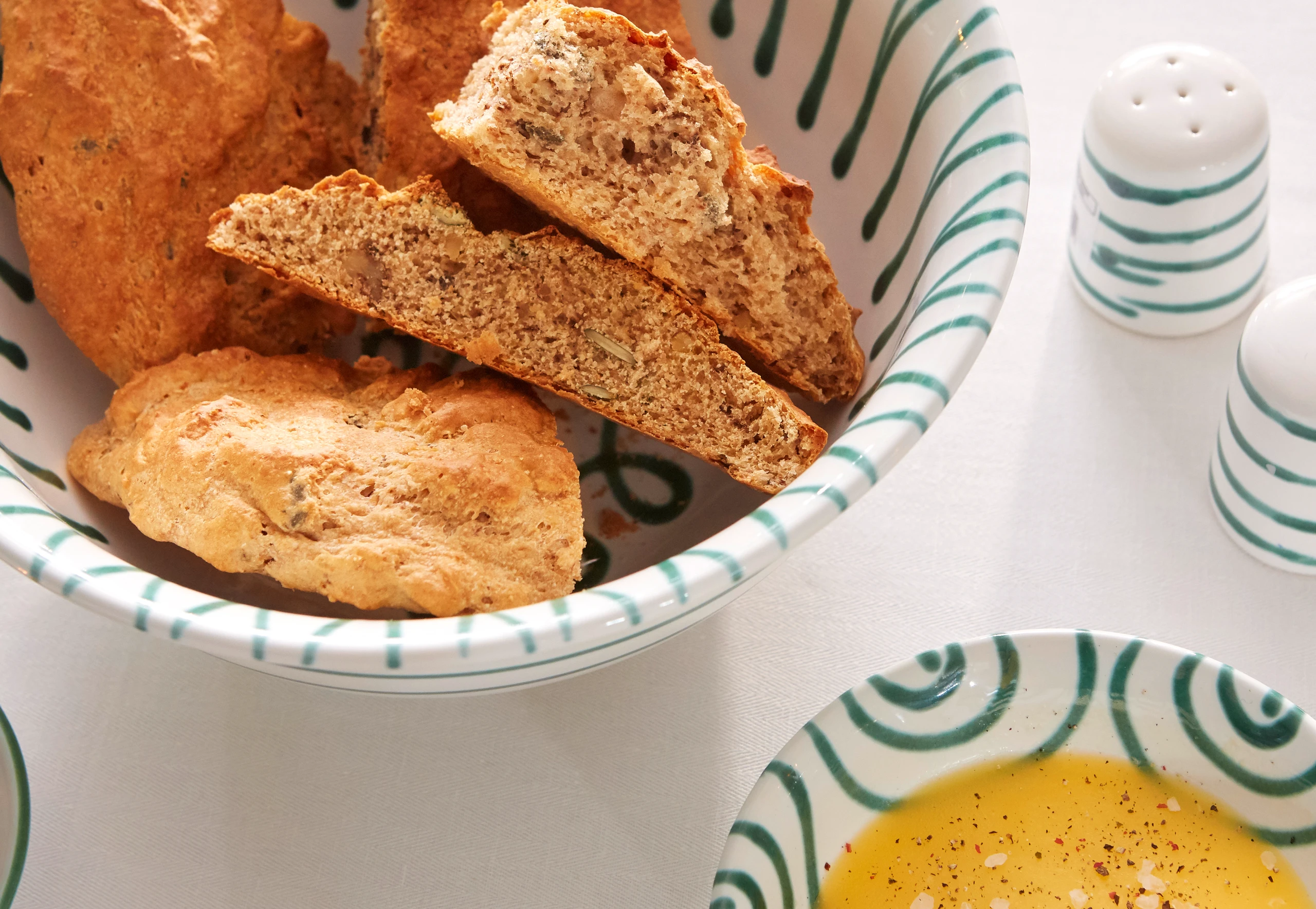 Mehle mit Backpulver, Salz und Zucker vermischen. Nüsse, Kürbiskerne und Buttermilch unterrühren. Mischung zu einem Teig verkneten.