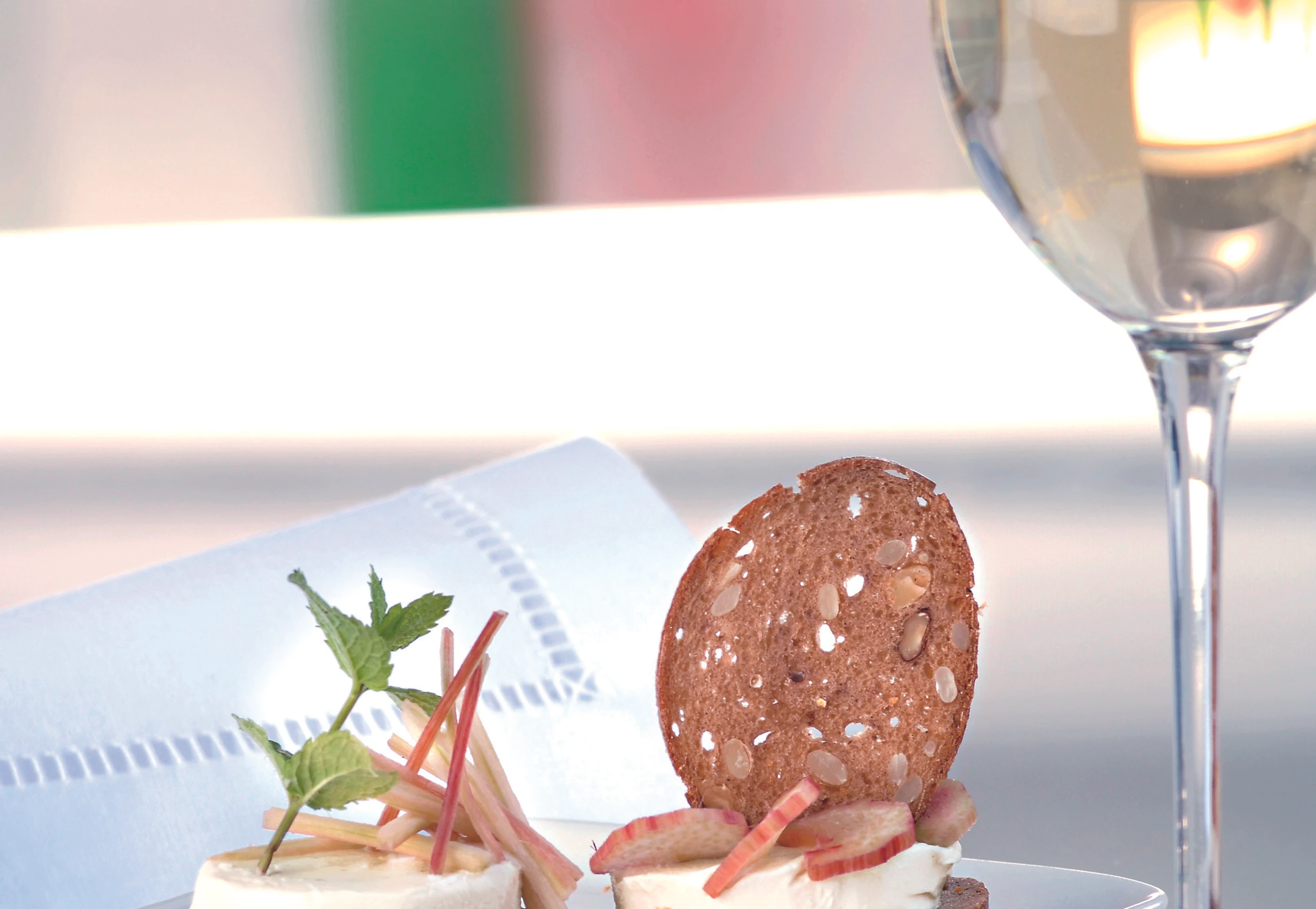 Käse in 16 Scheiben schneiden. Rhabarber abziehen und dünnblättrig schneiden bzw. Zwetschken entkernen und in feine Streifen schneiden. Käse mit Rhabarber bzw. Zwetschken belegen und mit Traubenkernöl beträufeln.