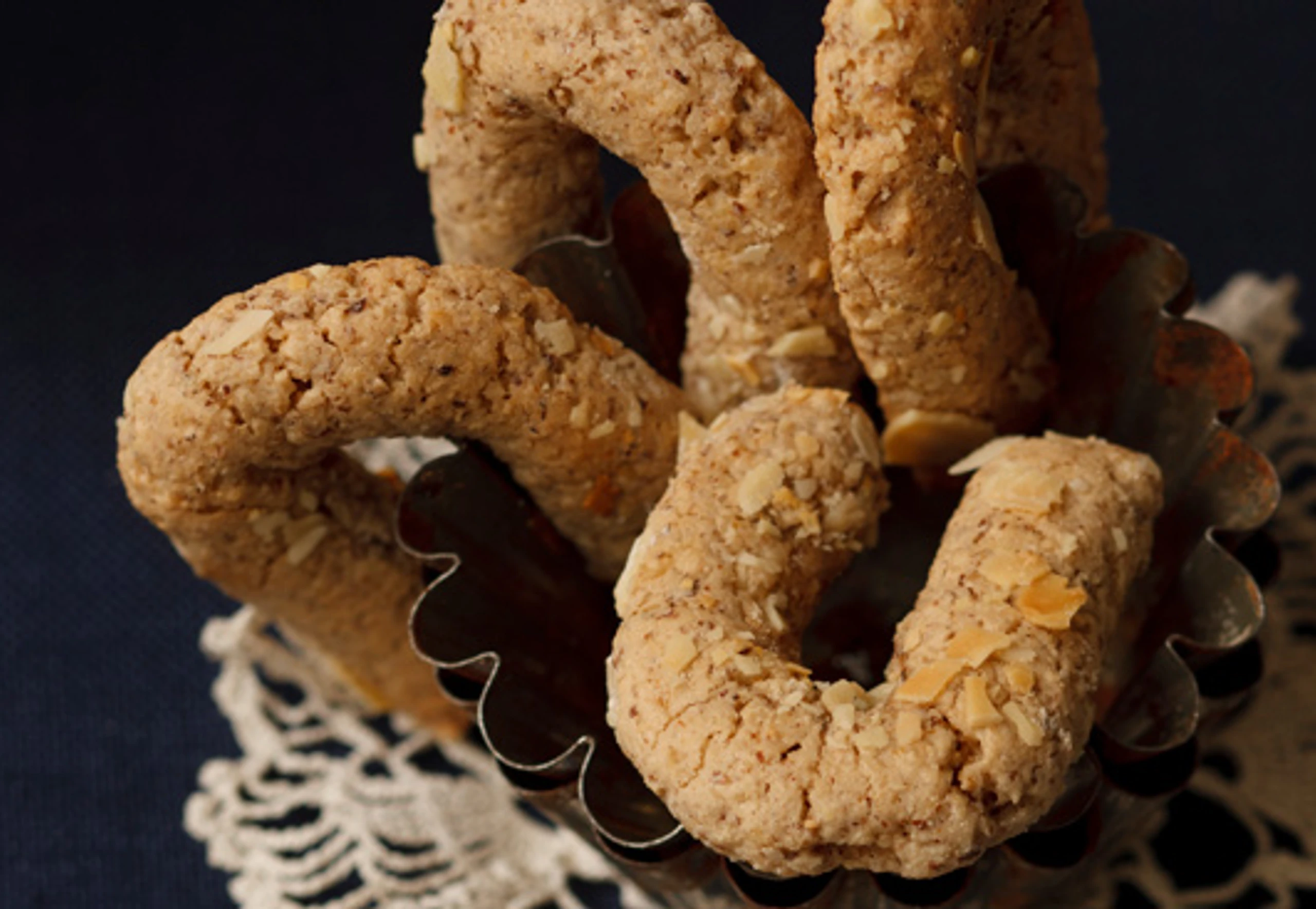 - Arbeitsfläche mit Mandelblättchen bestreuen. Teig durchkneten, zu einer Rolle formen, davon kleine Stücke abschneiden und ca. 10 cm lange Röllchen formen. Röllchen in die Mandelblättchen drücken und zu Kipferln formen.