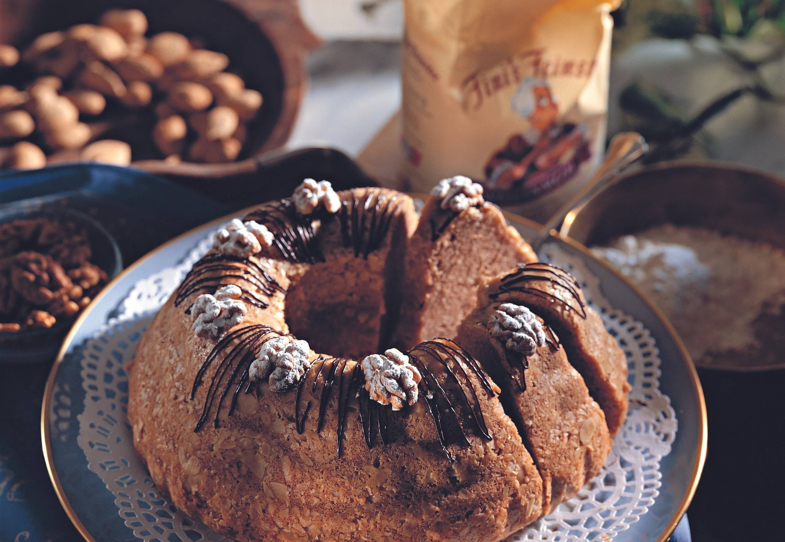 Für die Garnitur Schokolade grob hacken und über Wasserdampf schmelzen. Kuchen mit der geschmolzenen Schokolade verzieren. Nüsse mit Staubzucker bestreuen und den Kuchen damit belegen.