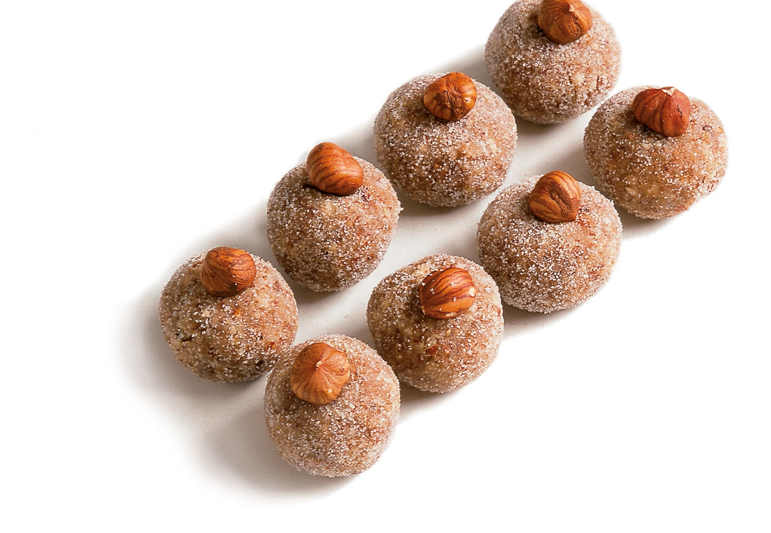 Vanilleschote entfernen, Zucker und Nüsse einrühren und die Masse auskühlen lassen. Aus der Masse 15 Kugeln formen und im Rohrzucker wälzen. Nusskugeln mit Haselnüssen garnieren.