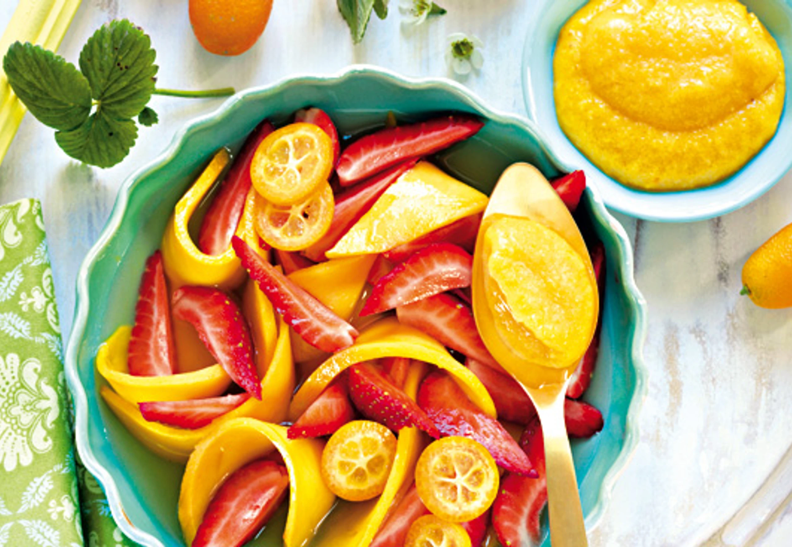 - Für den Fruchtsalat Erdbeeren putzen und in Spalten schneiden. Mango schälen. Mango und Kumquats in dünne Scheiben schneiden. Früchte mit dem frisch gepressten Orangensaft vermischen. Fruchtsalat mit der Marillencreme servieren.