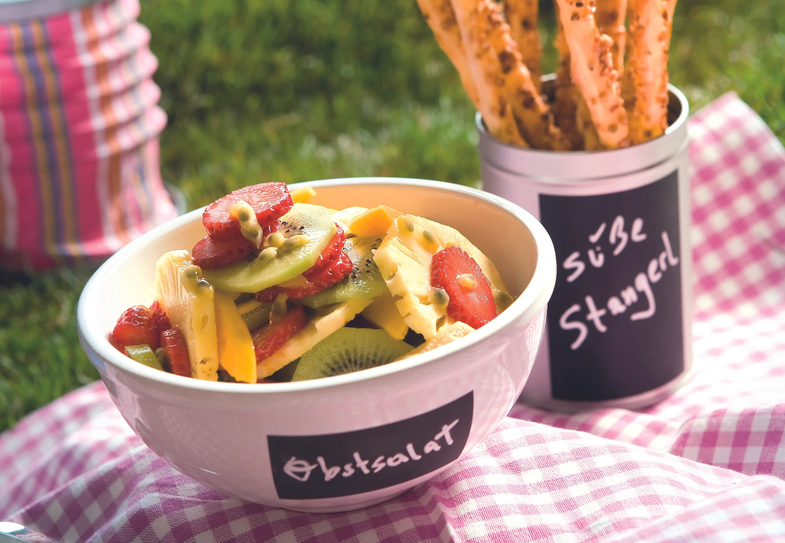 - Rohr auf 200°C vorheizen. Backblech mit Backpapier belegen. Blätterteig in ca. 1,5 cm breite Streifen schneiden und darauflegen. Ei und Obers verquirlen. Mit dem Finger kleine ?Dellen? in den Teig drücken und mit dem Eigemisch bepinseln. Mit Krokant bestreuen und im Rohr (mittlere Schiene) ca. 7 Minuten backen. Stangerln in eine Dose geben, Obstsalat extra verpacken.