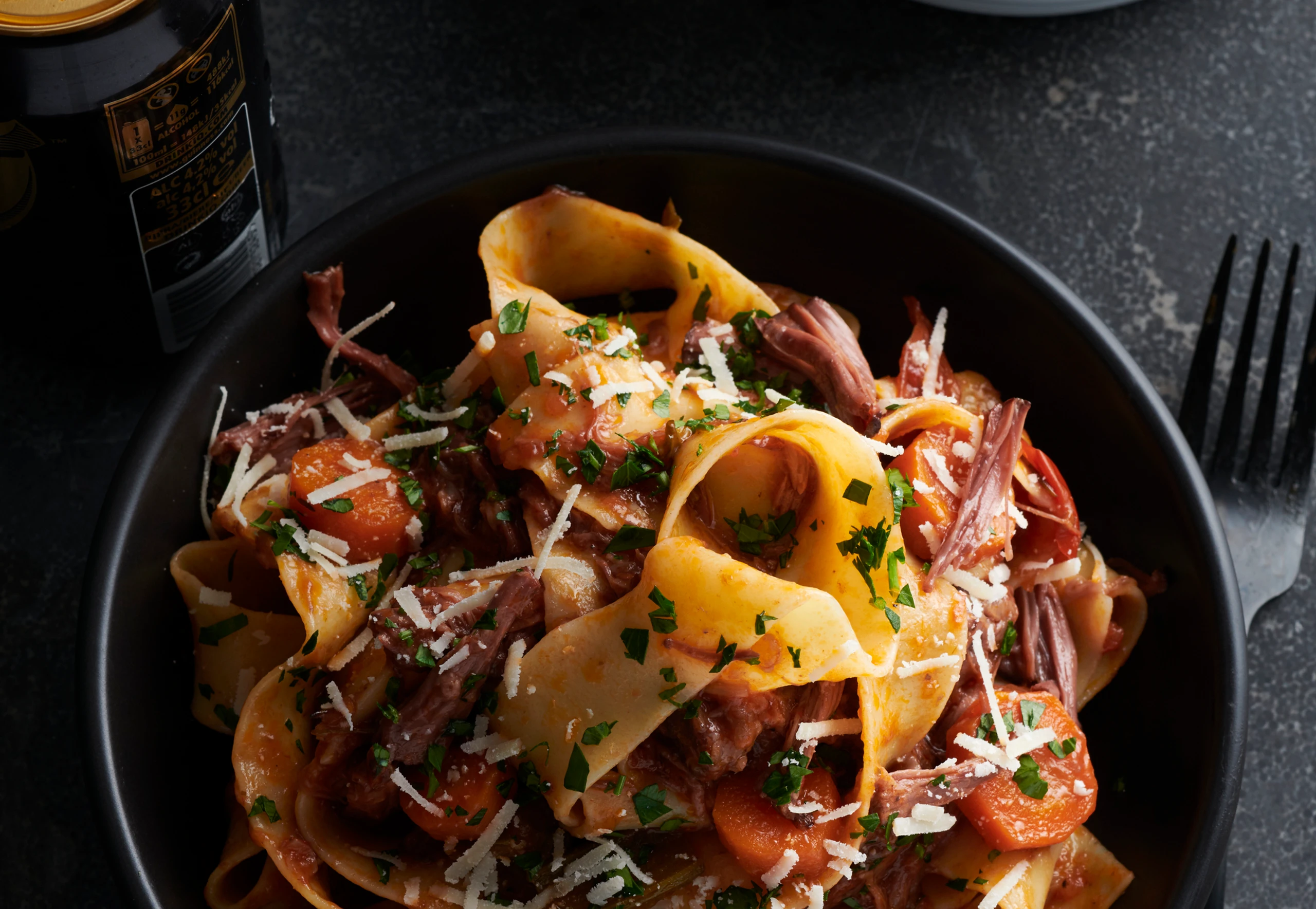 Pasta in reichlich Salzwasser al dente kochen und durch ein Sieb leeren. Pappardelle mit dem Ragout servieren und mit Parmesan bestreuen.