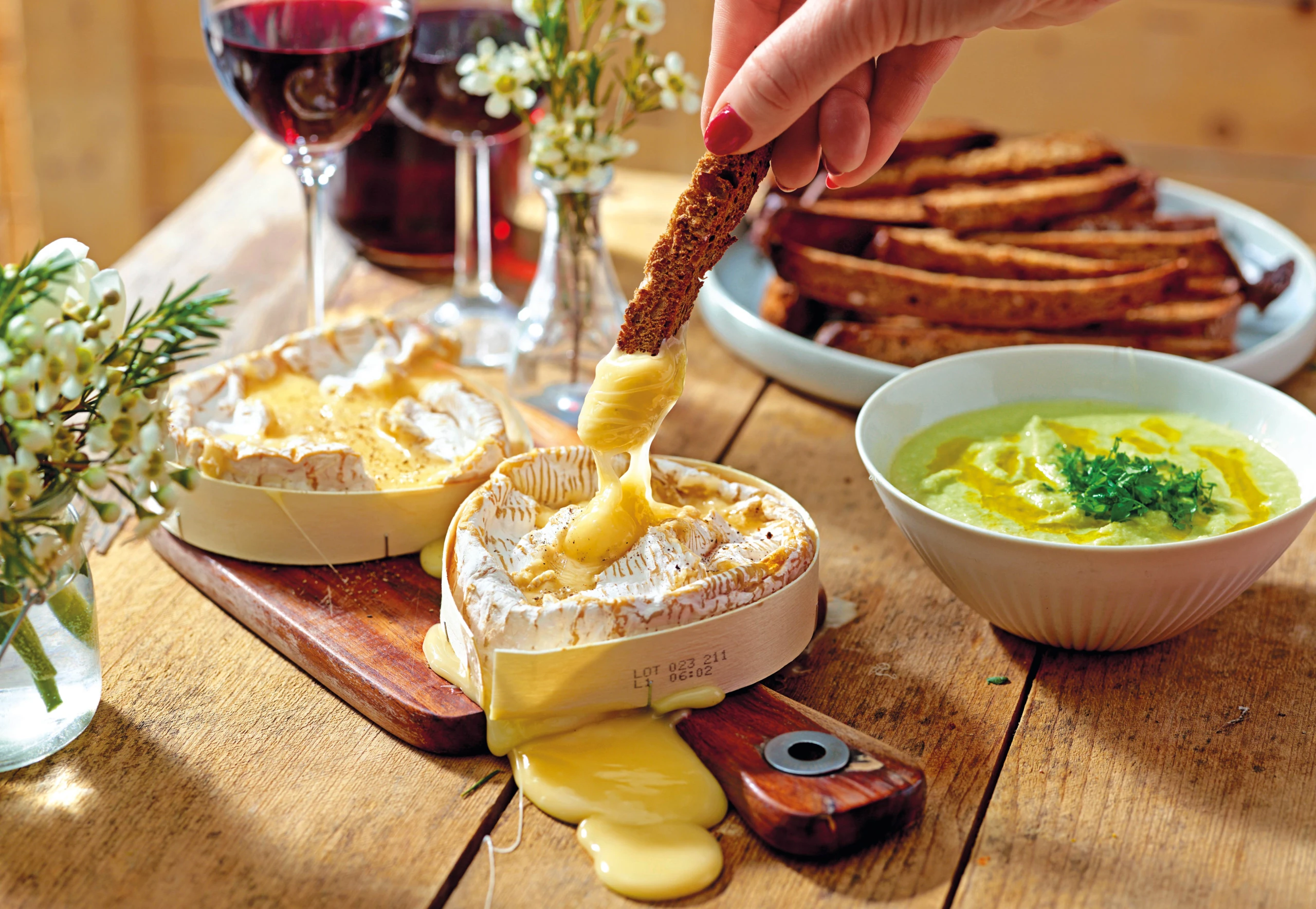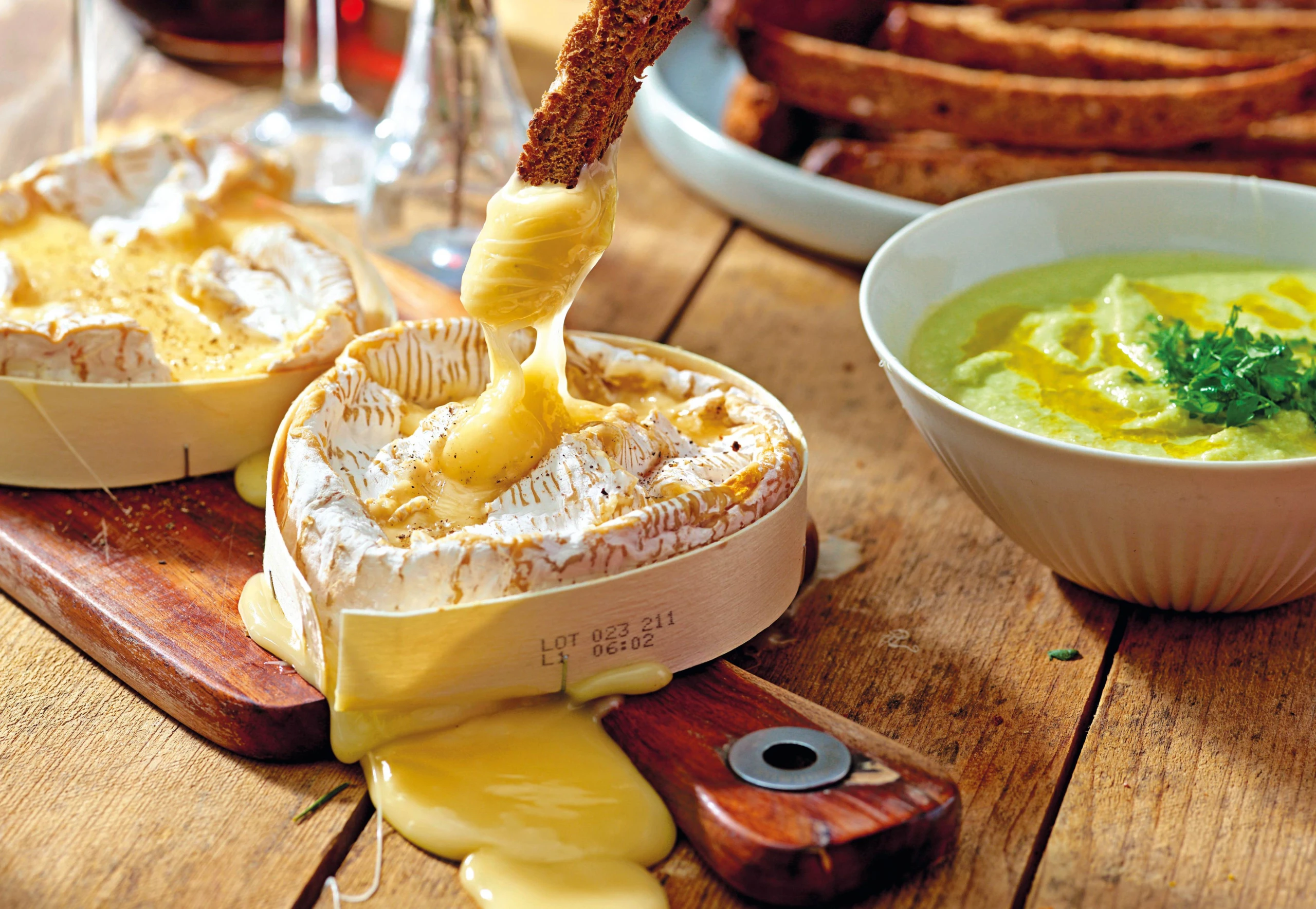 Ofen-Camembert mit Brotsticks und Spargelsalsa