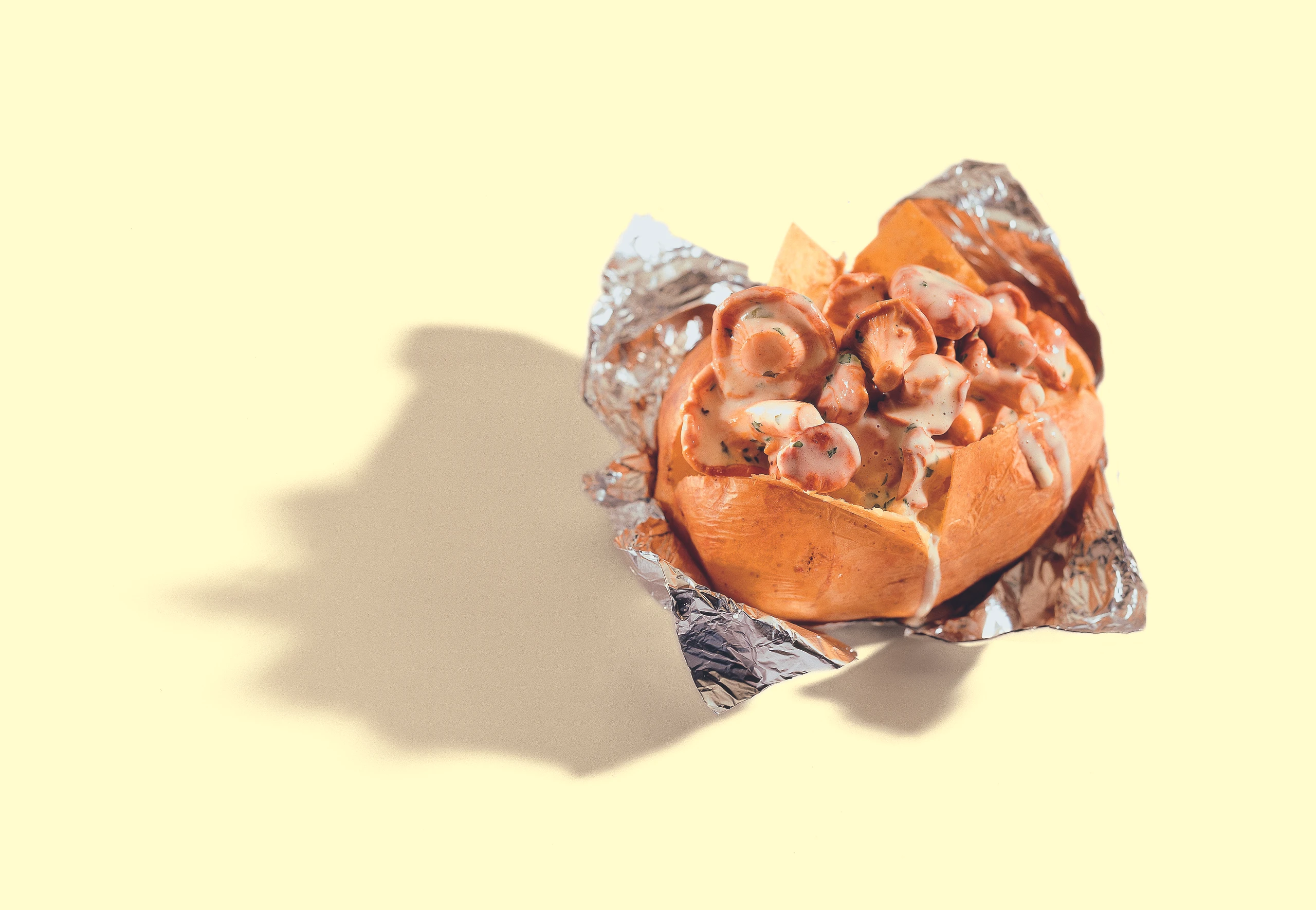 Gebackene Erdäpfel an der Oberseite der Länge nach mit einem spitzen Messer einschneiden. Erdäpfel ein wenig auseinander drücken, mit reichlich Schwammerlsauce füllen und rasch servieren.
