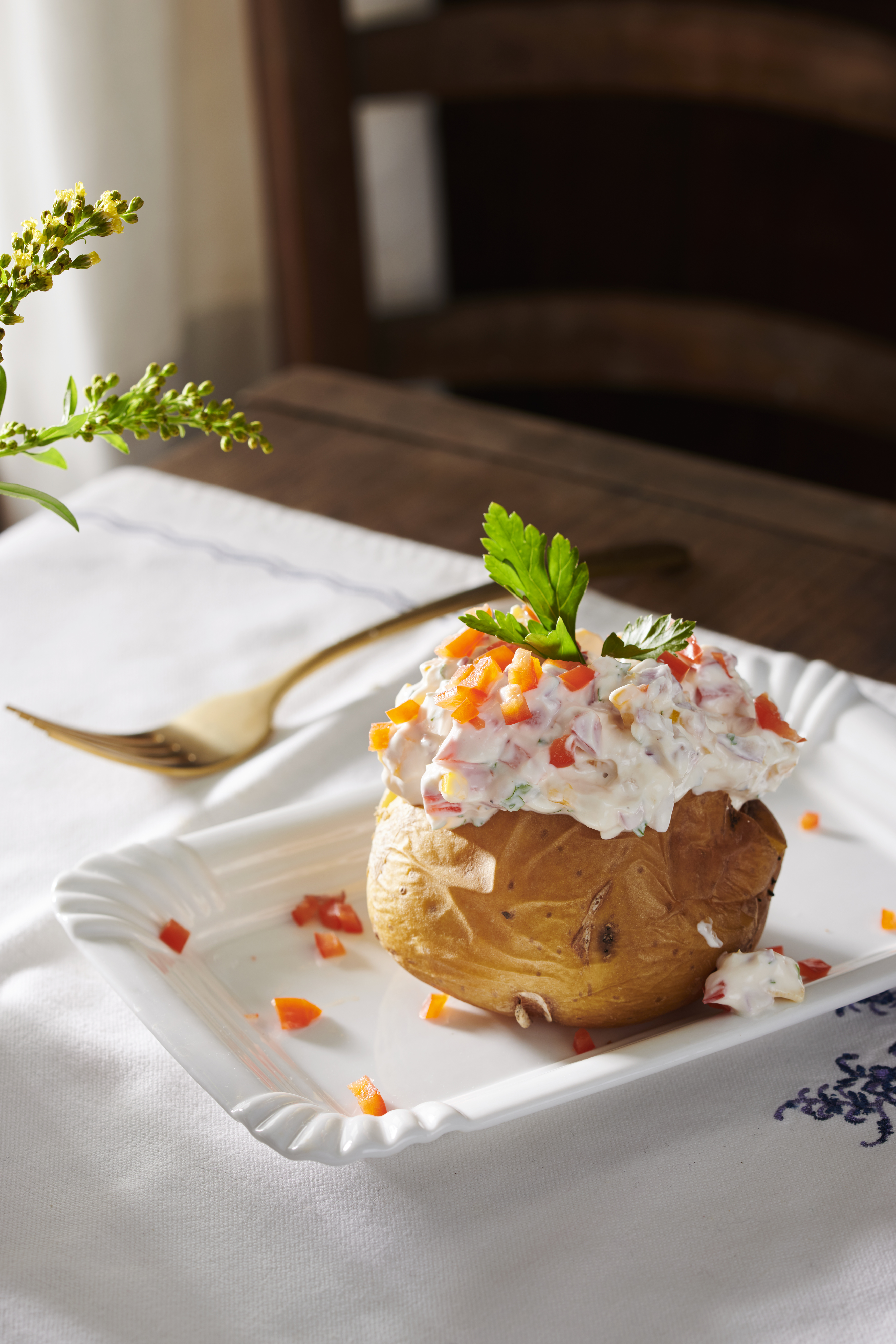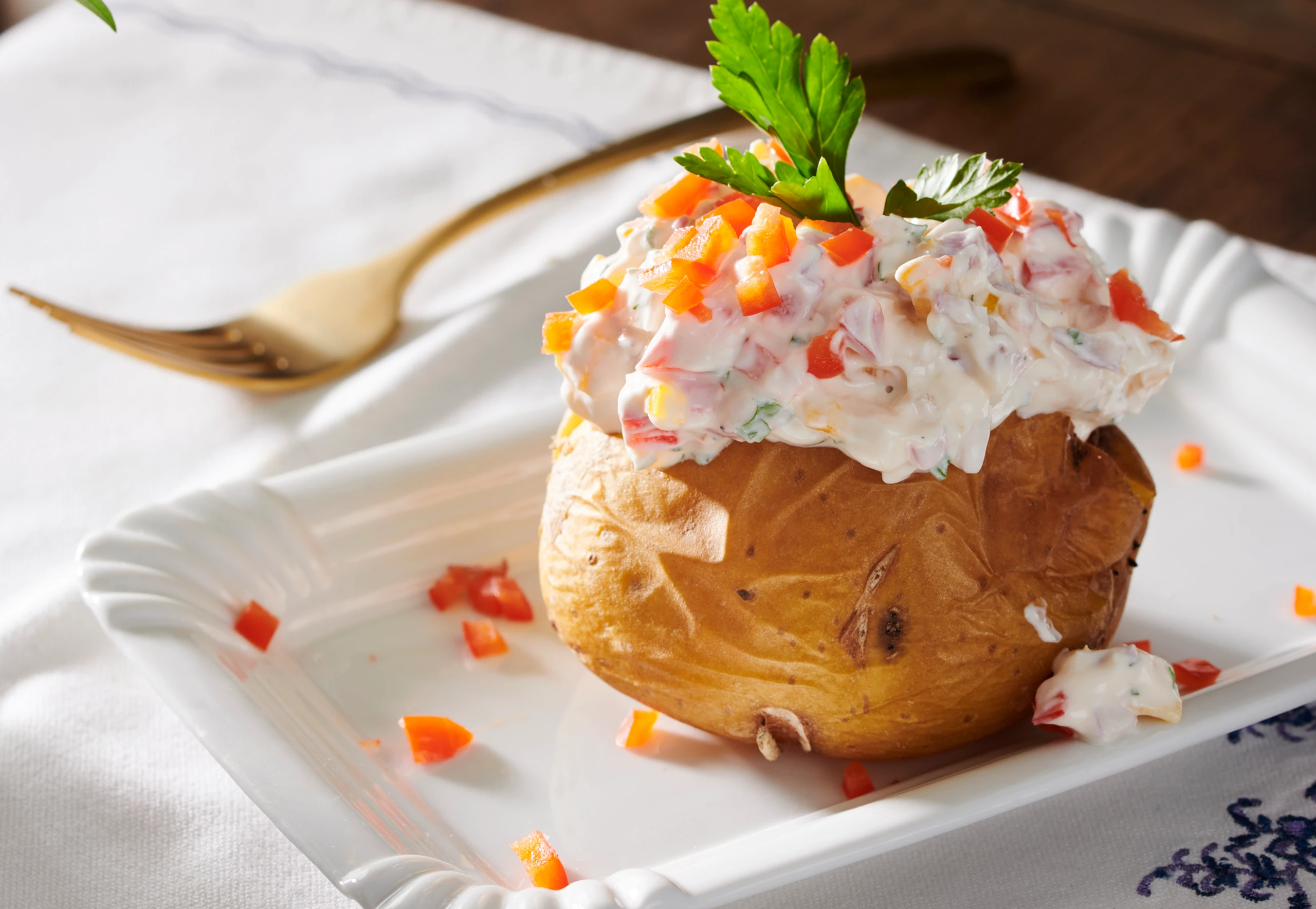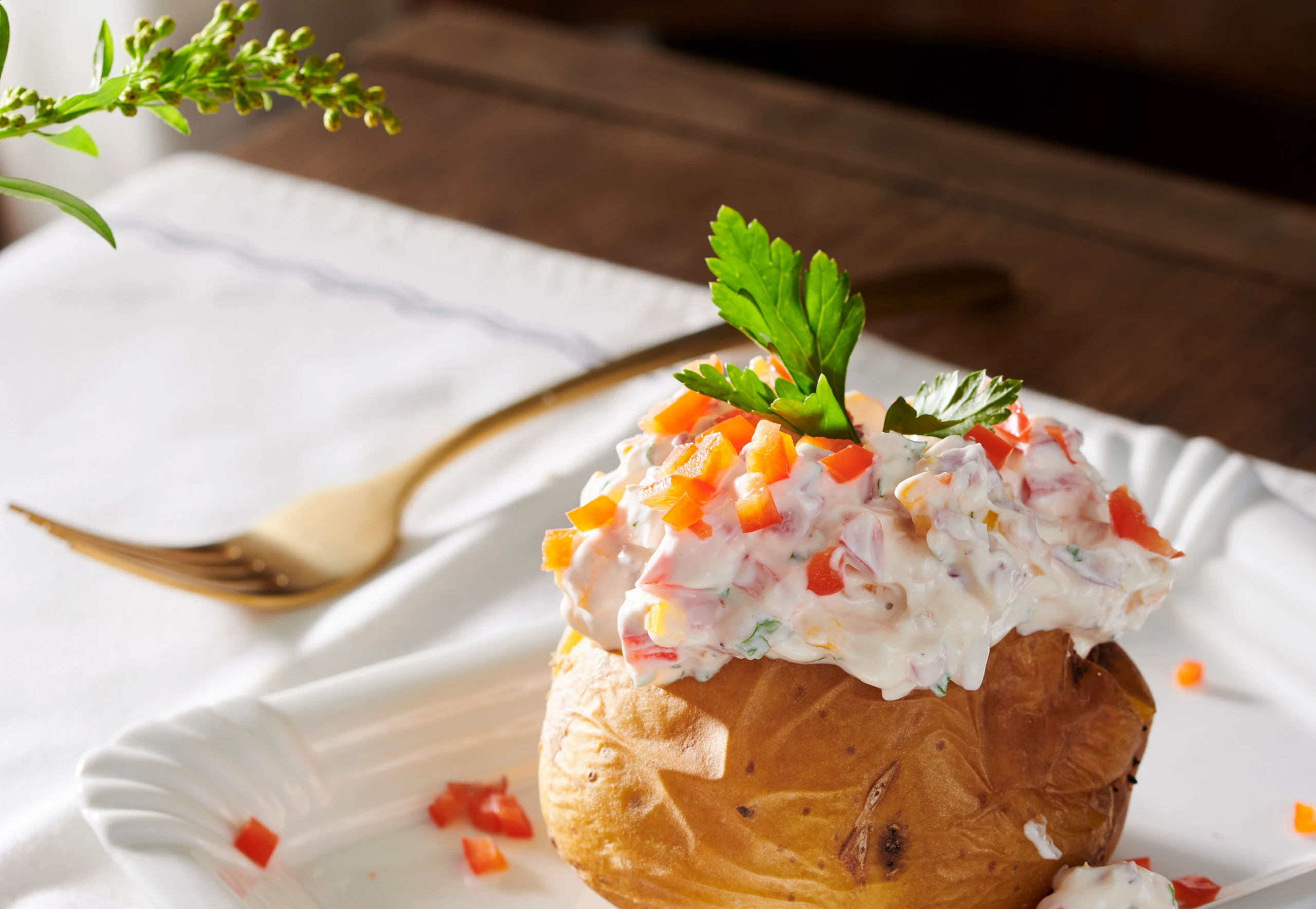 Erdäpfel aus dem Rohr nehmen und mit dem Gemüsetopfen füllen. Mit Petersilie garnieren.
