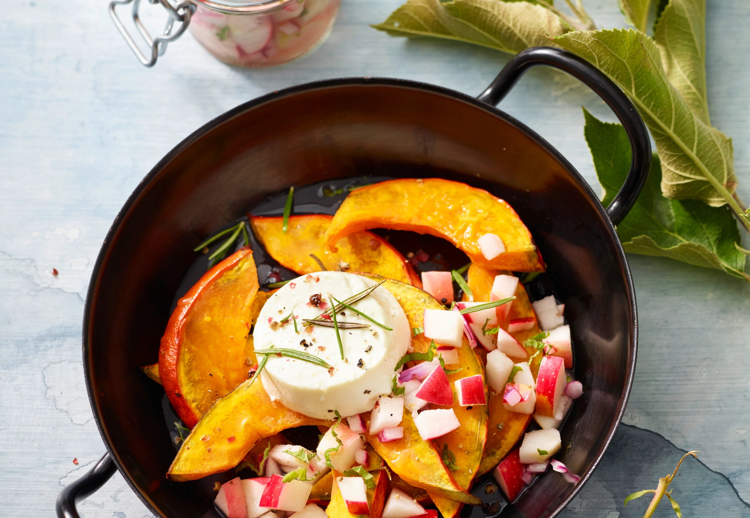 5 Minuten vor Ende der Garzeit Ziegenkäse auf den Kürbis setzen, mit Pfeffer bestreuen und mitbraten. Kürbis und Ziegenkäse mit der Apfelsalsa anrichten.