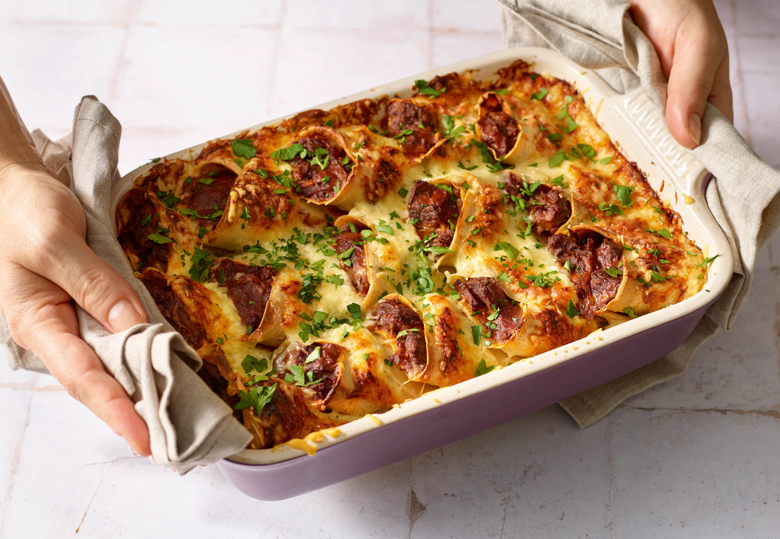 Gulasch am unteren Drittel der Palatschinken verteilen. Palatschinken straff einrollen, in der Mitte durchschneiden und in die Auflaufform schichten.