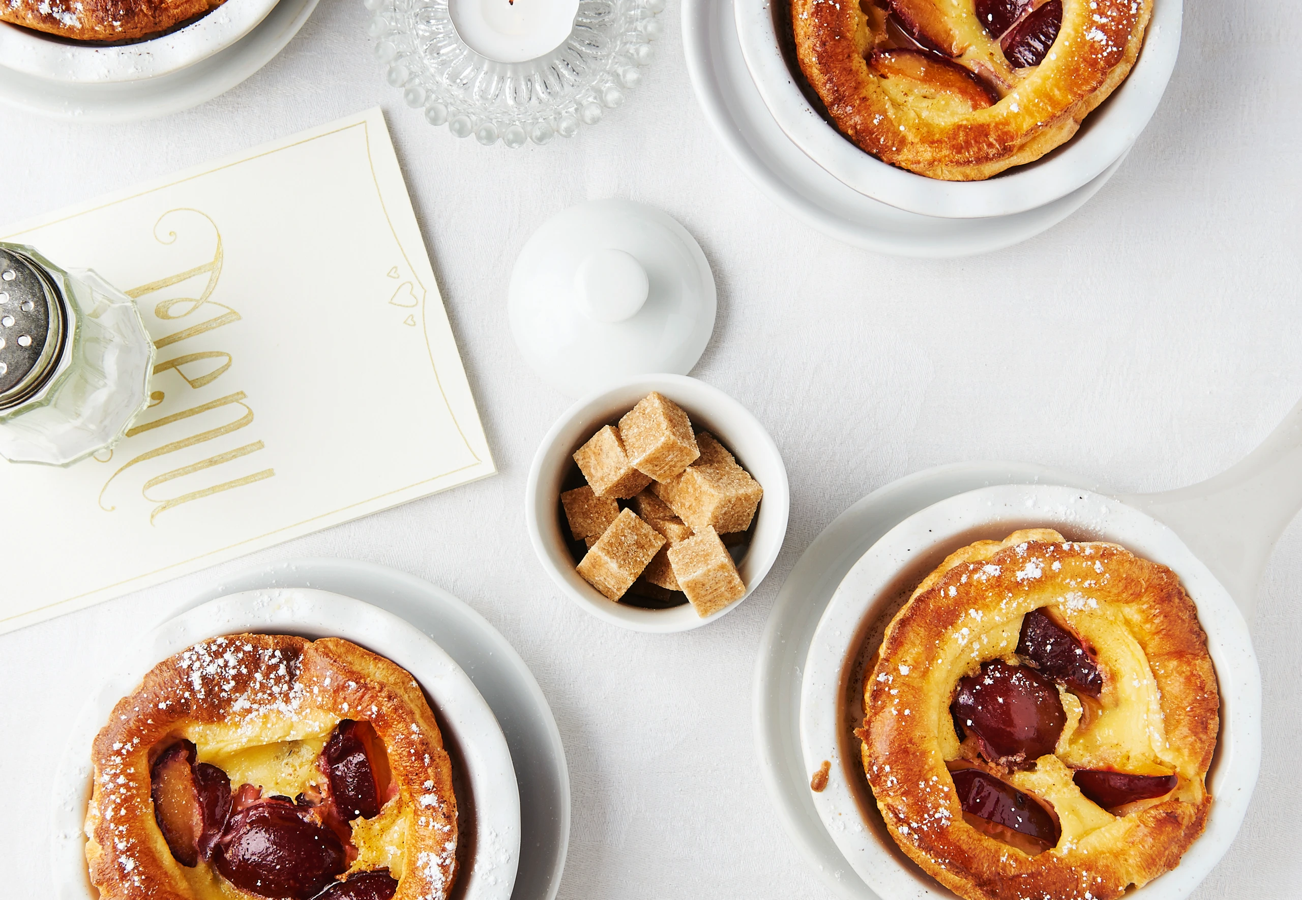 Förmchen nochmal kurz ins Rohr stellen, damit die Butter heiß wird. Herausnehmen, die Palatschinkenmasse in die Mitte der Förmchen gießen, mit Zwetschken belegen und im Rohr (mittlere Schiene) ca. 20 Minuten backen. Herausnehmen, mit Staubzucker bestreuen und sofort servieren.