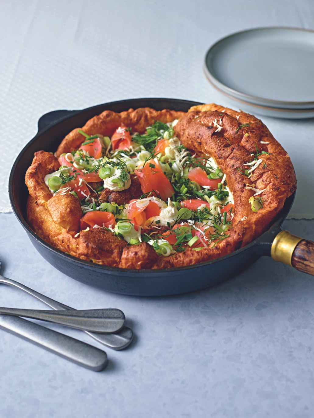 Pfannkuchen aus dem Rohr nehmen, überkühlen lassen. Creme in einen Dressiersack füllen und damit Tupfen auf den Pfannkuchen dressieren. Mit Lachsforelle belegen. Jungzwiebeln, Schnitt- lauch, Dille und restlichen Kren darüberstreuen. Eventuell etwas Zitronenschale darüber reiben.
