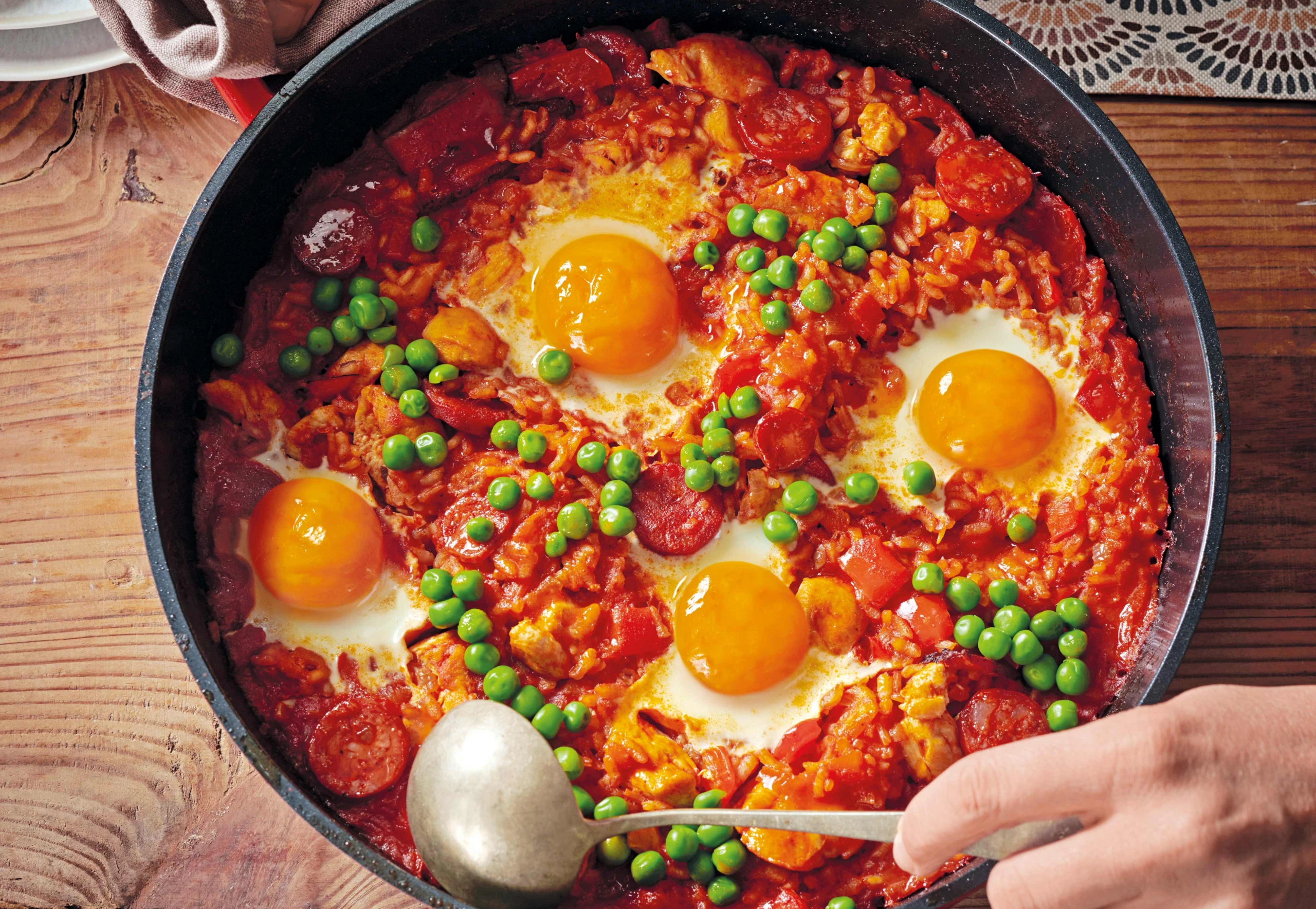 Deckel abnehmen und den Reis gut verrühren. Mulden formen und die Eier vorsichtig hineingleiten lassen. Erbsen und Speck darauf verteilen. Im Rohr ca. 5 Minuten überbacken. Herausnehmen und noch heiß servieren.
