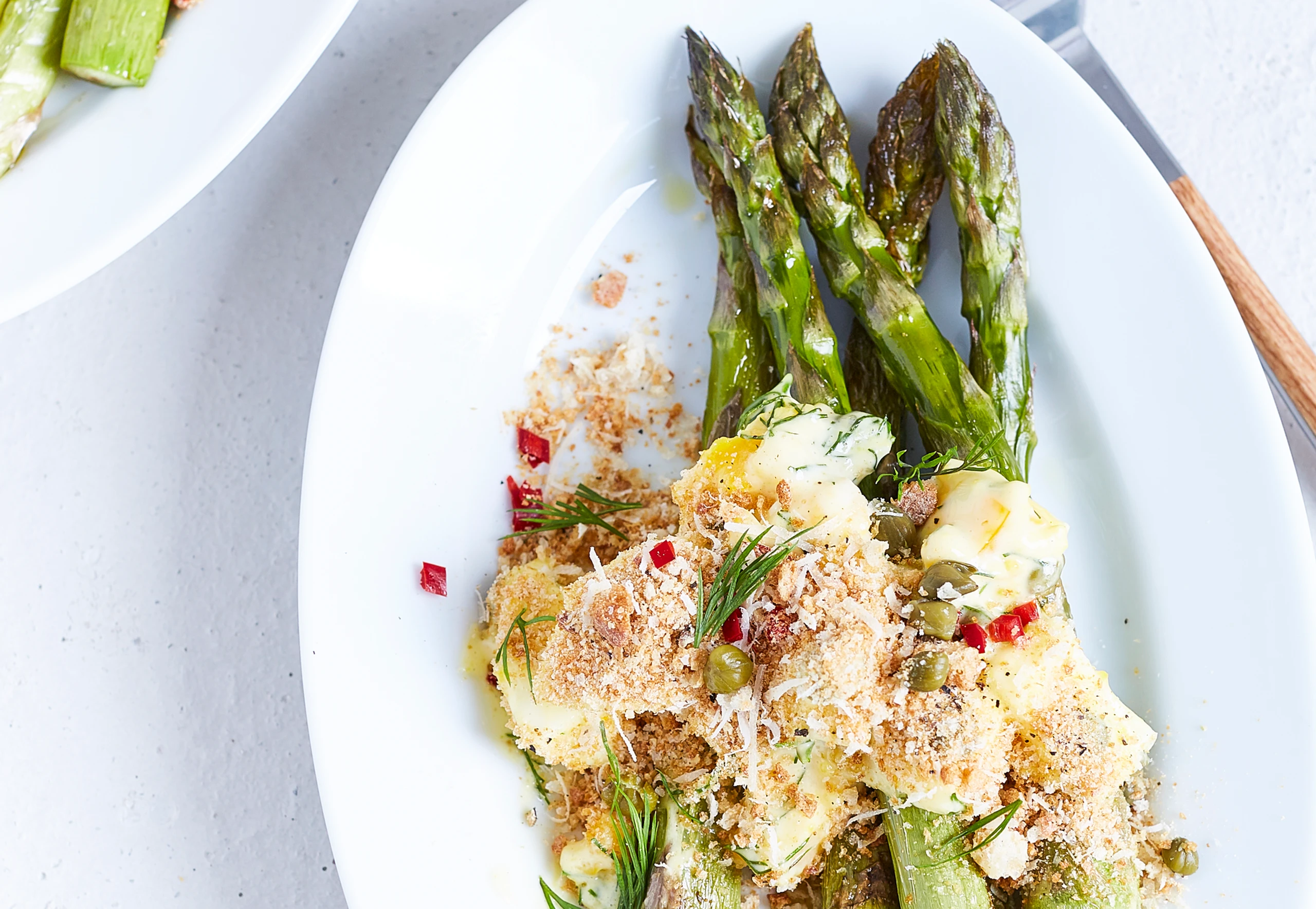 Ofenspargel mit Eisalat und Chili-Bröseln