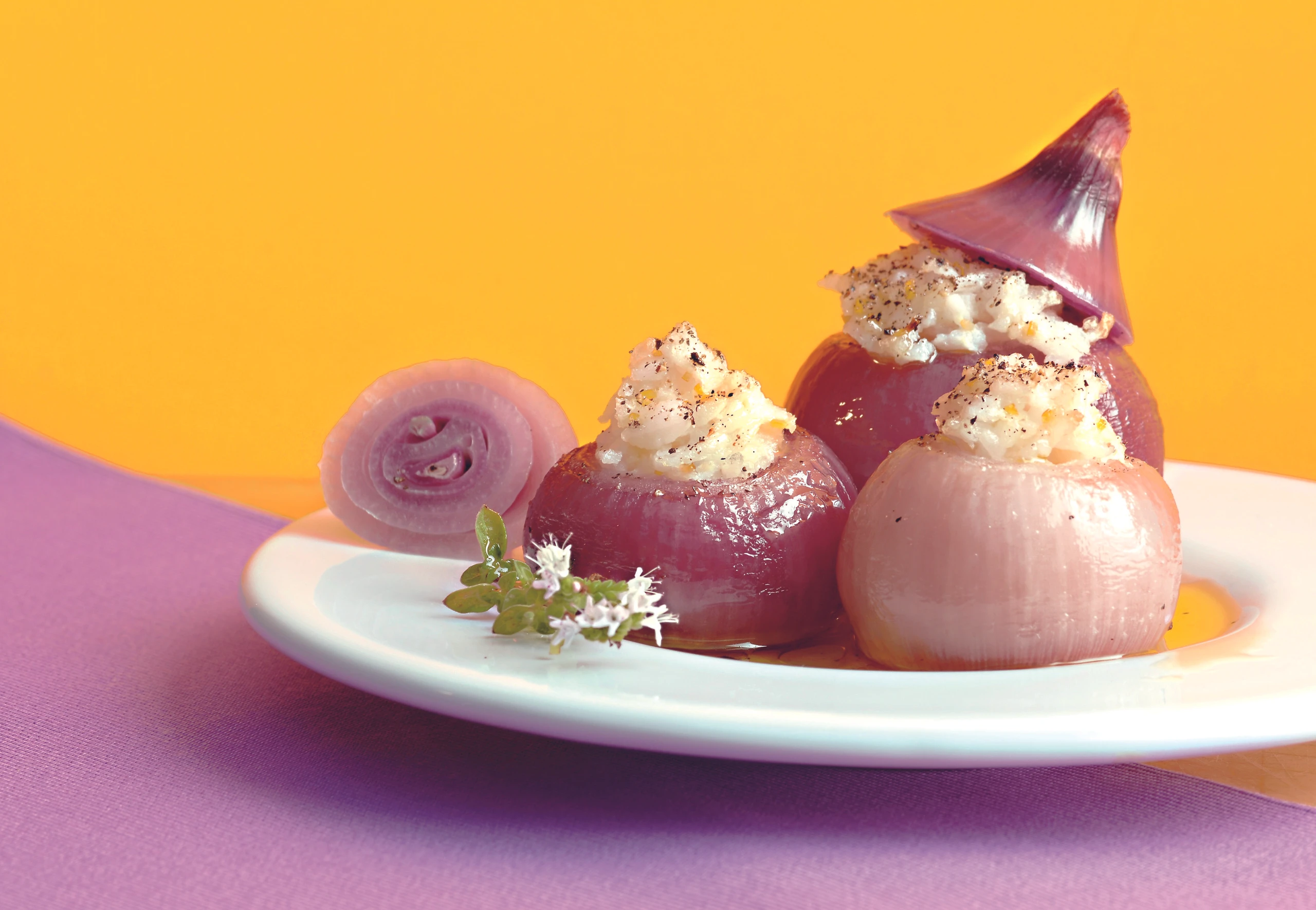 Reis etwas überkühlen lassen. Zitronenschale in den Reis reiben, Käse und Dotter untermischen. Zwiebeln mit der Masse füllen, in eine feuerfeste Form oder Pfanne stellen. Wenig Öl und Wasser zugießen, Zwiebeln im Rohr ca. 15 Minuten backen. Mit Majoran garniert servieren.