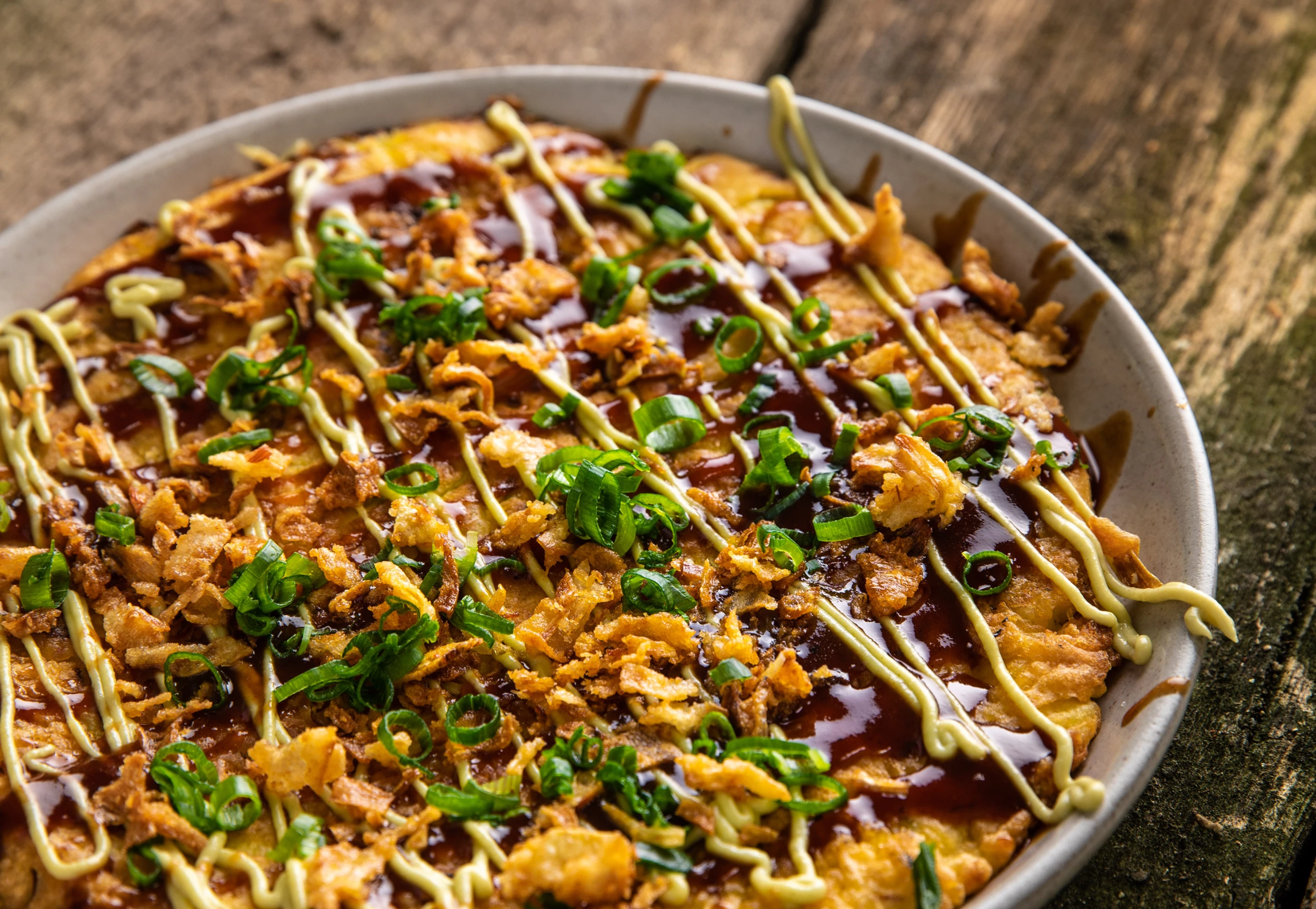 Währenddessen Ketchup, Worcestersauce, Austernsauce und Ahornsirup vermischen. Mit der Sauce und der Mayonnaise ein gitterförmiges Muster aufspritzen, den Rest dazu reichen. Mit Bonitoflocken und grünen Jungzwiebelringen garnieren. Zum Servieren wie eine Pizza in Stücke schneiden.
