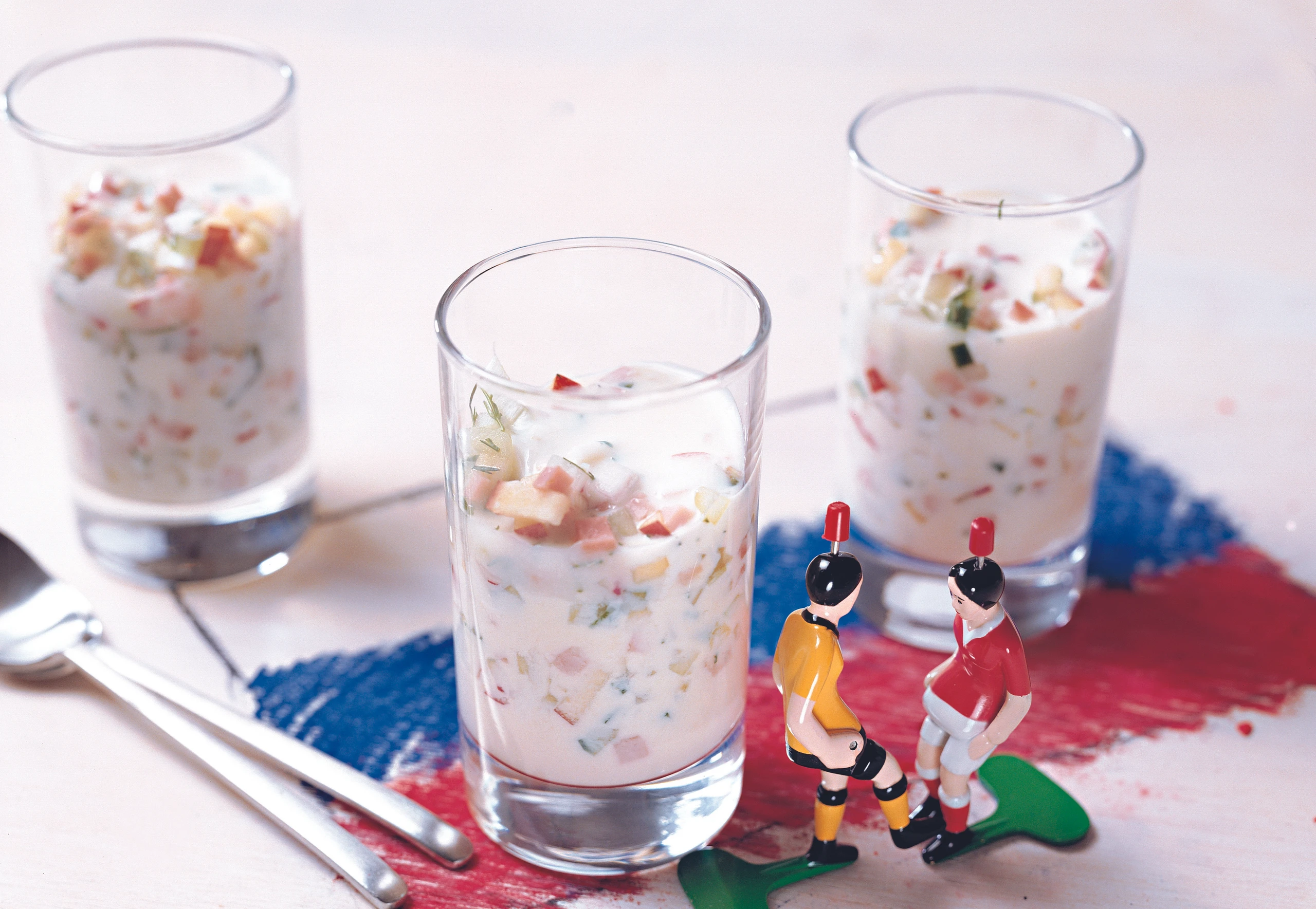 Schinken, Gemüse, Äpfel und Eiweiß in kleine Würfel schneiden. Dottersauce darüber gießen und durchmischen. Suppe für ca. 2 Stunden kalt stellen. Suppe in Gläsern anrichten.
