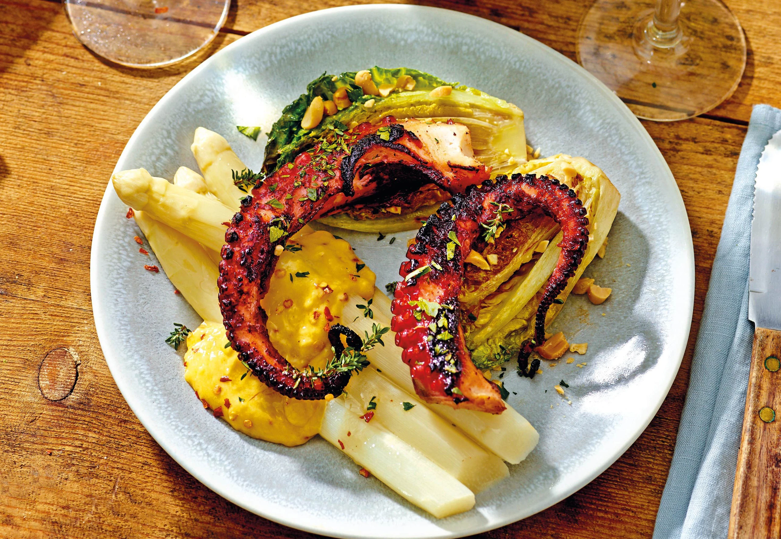 Oktopus mit Honig-Chilimarinade, Spargel und Limettenaioli