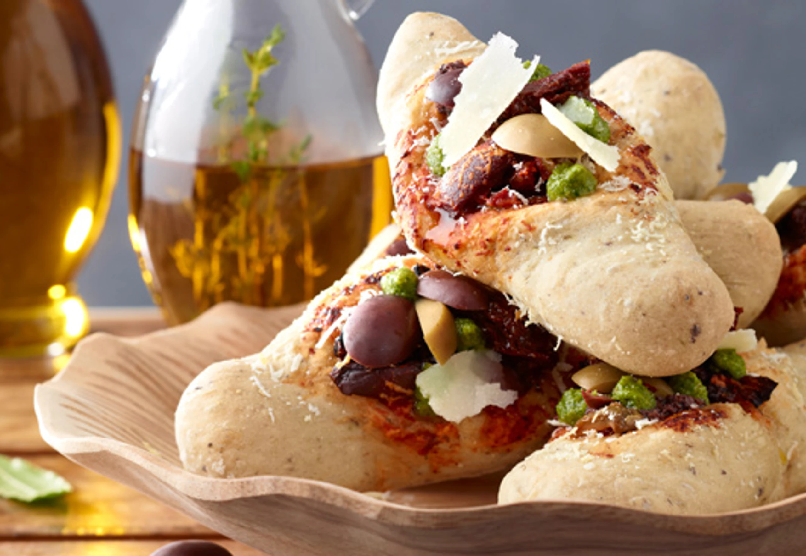 Teigkugeln zu Rollen formen, auf ein mit Backpapier belegtes Blech legen und 15 Minuten rasten lassen. Rollen längs einschneiden und ein wenig auseinanderdrücken. Passierte Paradeiser, Oliven, getrocknete Paradeiser, Pizzagewürz und Parmesan darauf verteilen. Im Rohr (mittlere Schiene) 15-20 Minuten backen.