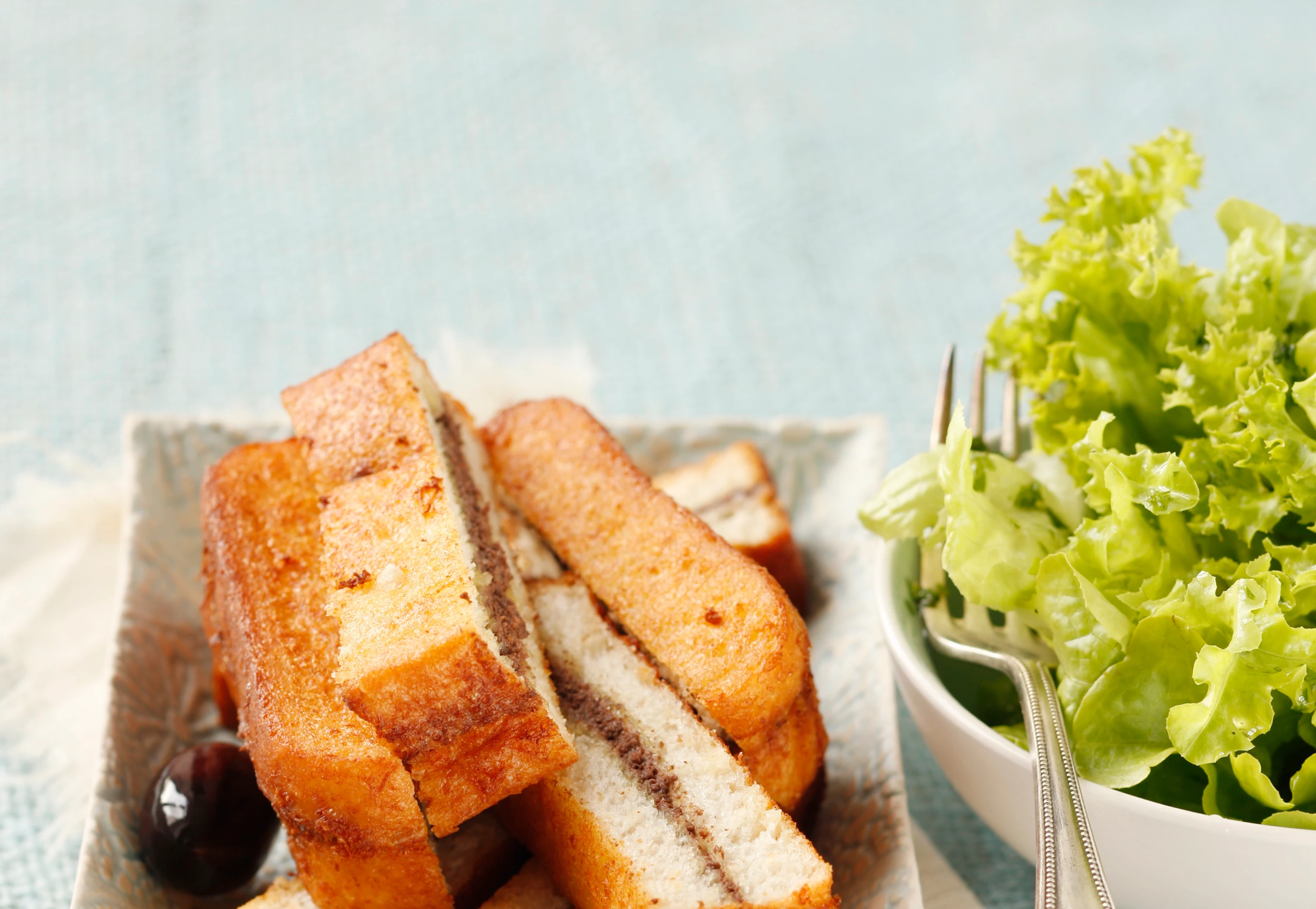 Die Hälfte von den Brotscheiben gleichmäßig mit Tapenade bestreichen, mit den übrigen Brotscheiben abdecken und behutsam zusammendrücken. Milch mit Eiern und Parmesan verquirlen, mit Salz und Pfeffer würzen.