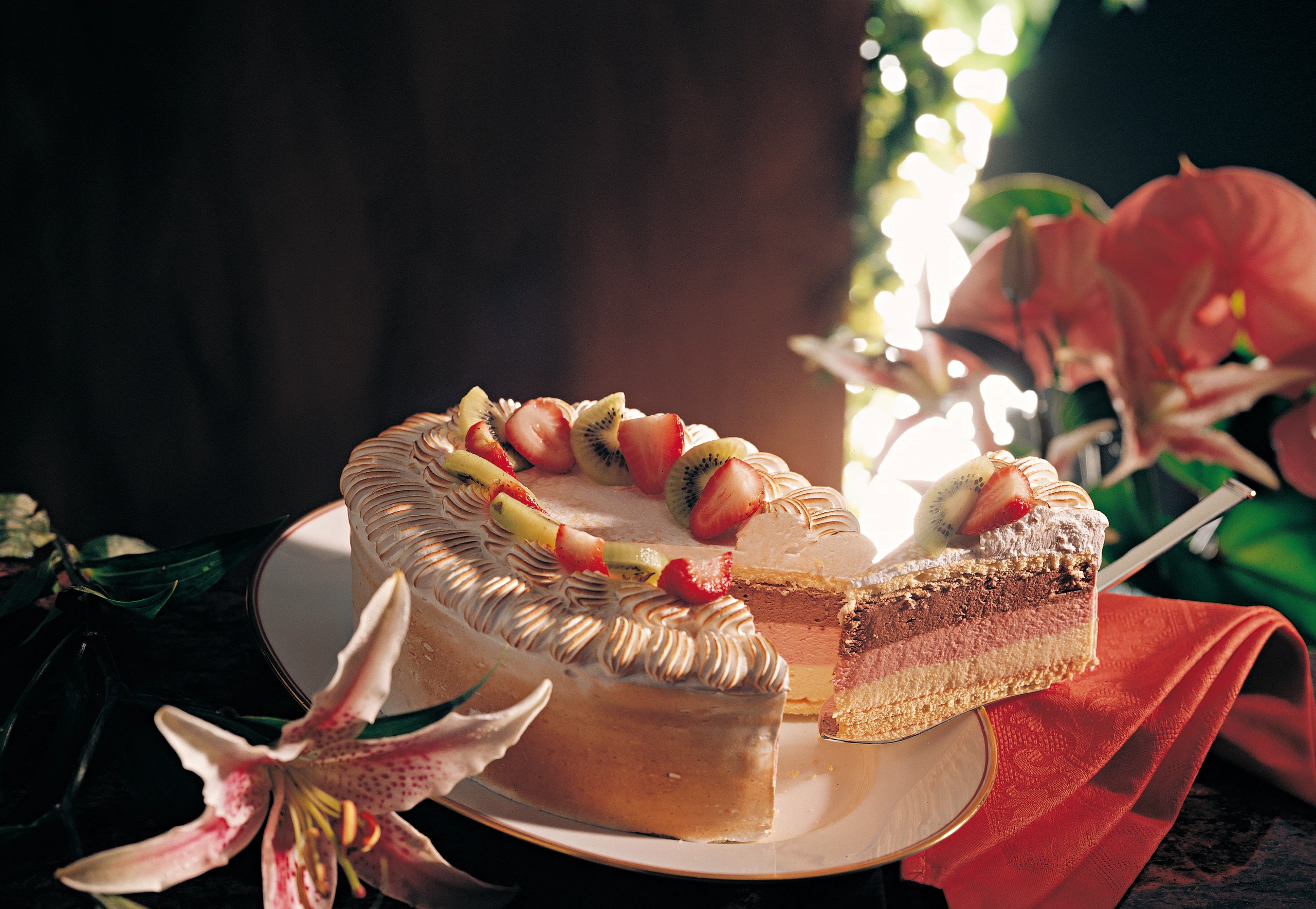 Gefrorenen Kuchen auf eine feuerfeste Platte stürzen. Kuchen rundum mit Schnee bestreichen, eventuell mit einem Muster dekorieren (dafür den Schnee in einen Dressiersack mit Sterntülle füllen).