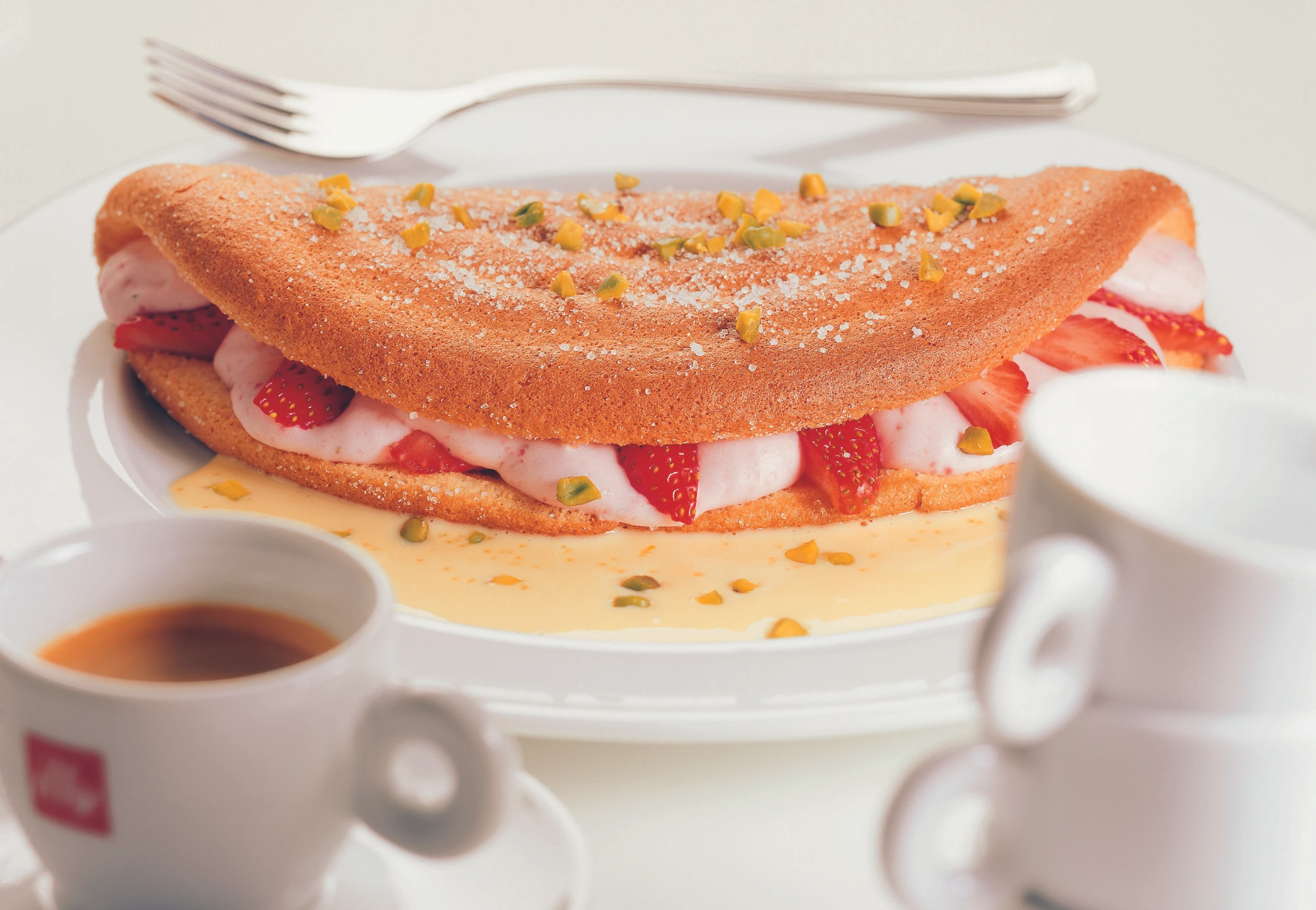 Creme in einen Dressiersack mit glatter Tülle füllen und in die Biskuitomelettes dressieren. Omelettes mit Erdbeerstücken garnieren, mit Pistazien und Kristallzucker bestreuen. Dazu passt eine Vanillesauce.