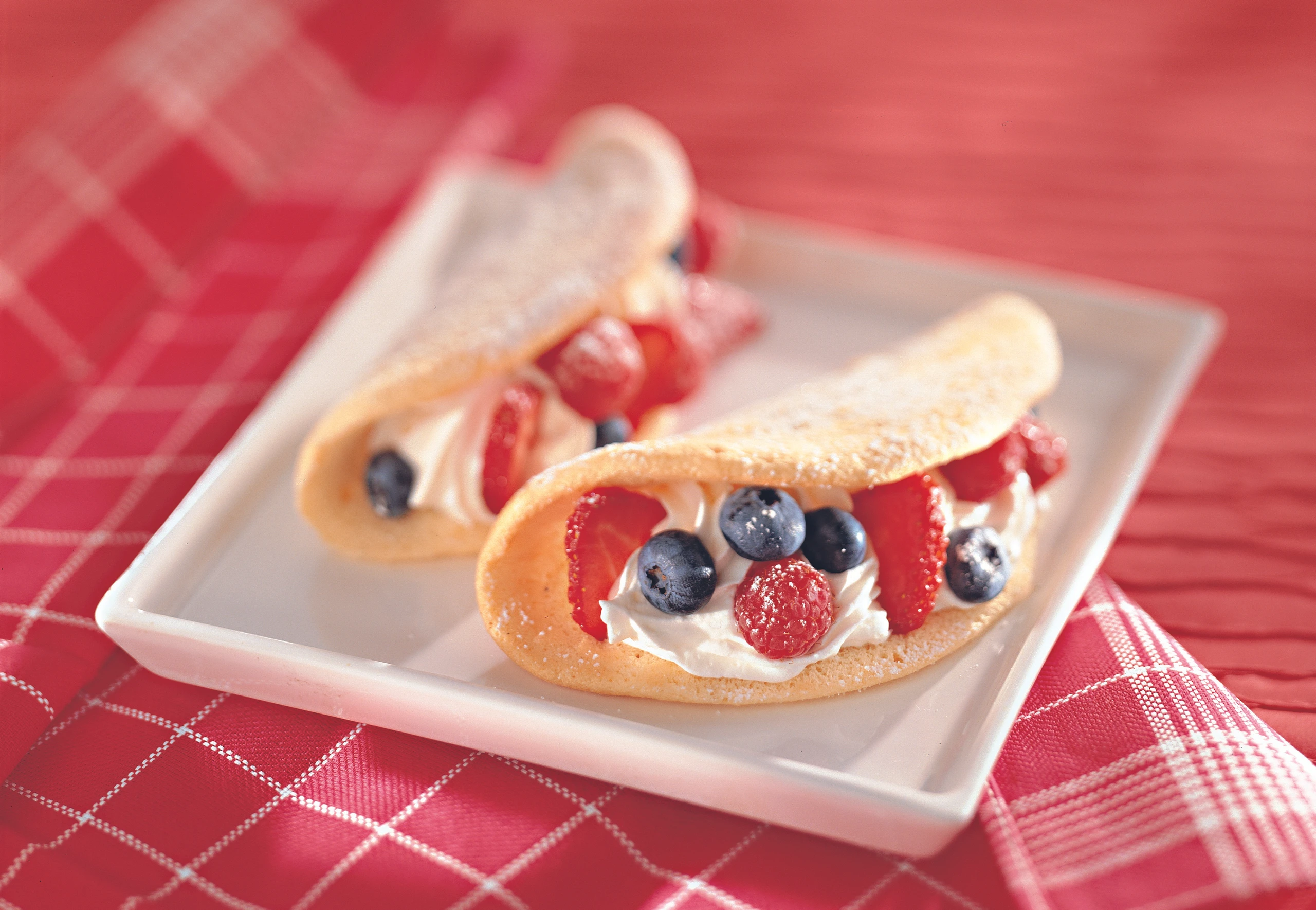 Obers auf eine Hälfte der Omeletten dressieren, unbelegte Teigfläche darüber klappen und behutsam andrücken. Obers mit den Beeren garnieren. Tascherln mit Staubzucker bestreuen.