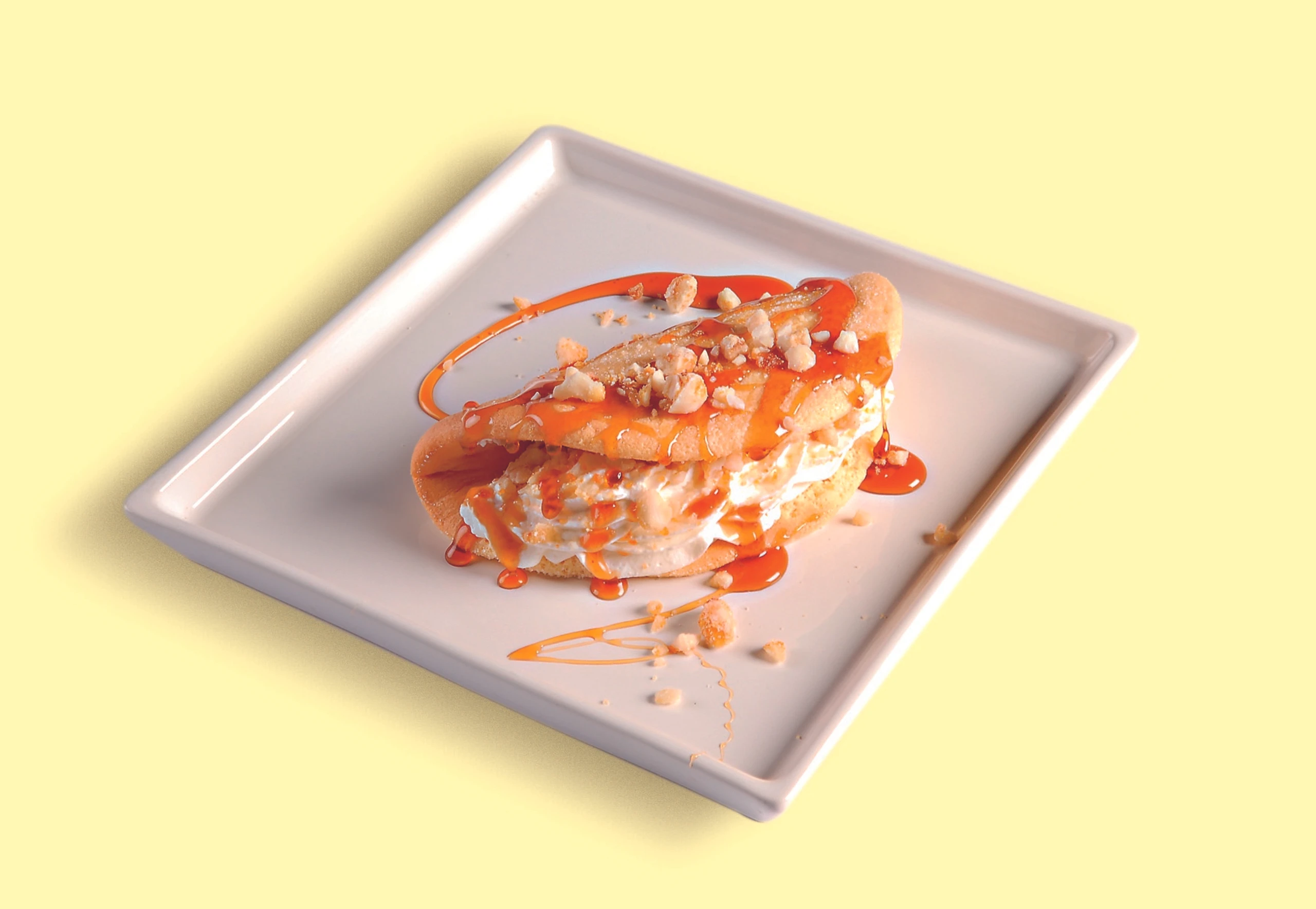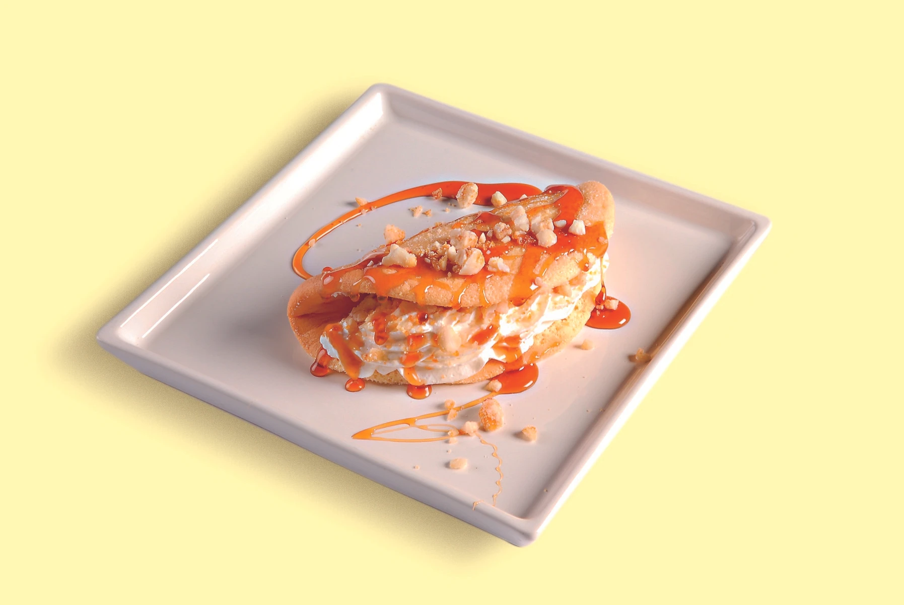 Obers mit Zucker mischen und dickcremig aufschlagen. Omelettes mit Obers füllen, mit Honig und Mandeln garnieren.