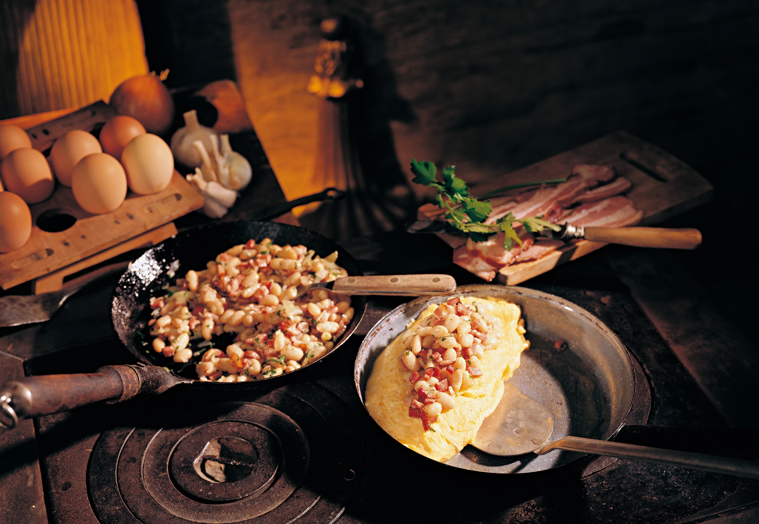 Omelettes mit Speck und Bohnen