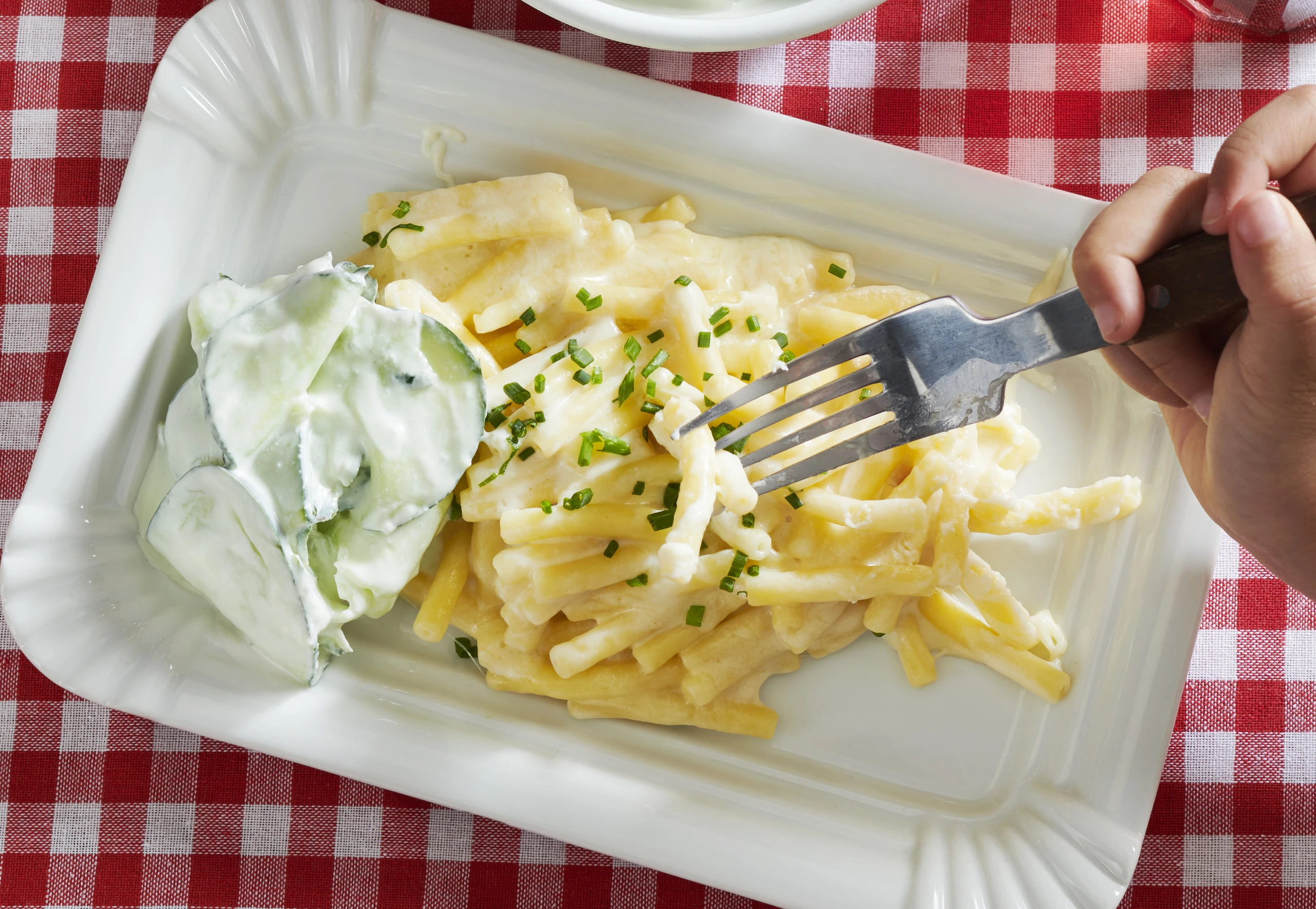 Cheddar und Mozzarella unterrühren und schmelzen lassen. Mit Salz und Pfeffer abschmecken. Anrichten, mit Schnittlauch bestreuen und mit dem Gurkensalat servieren.