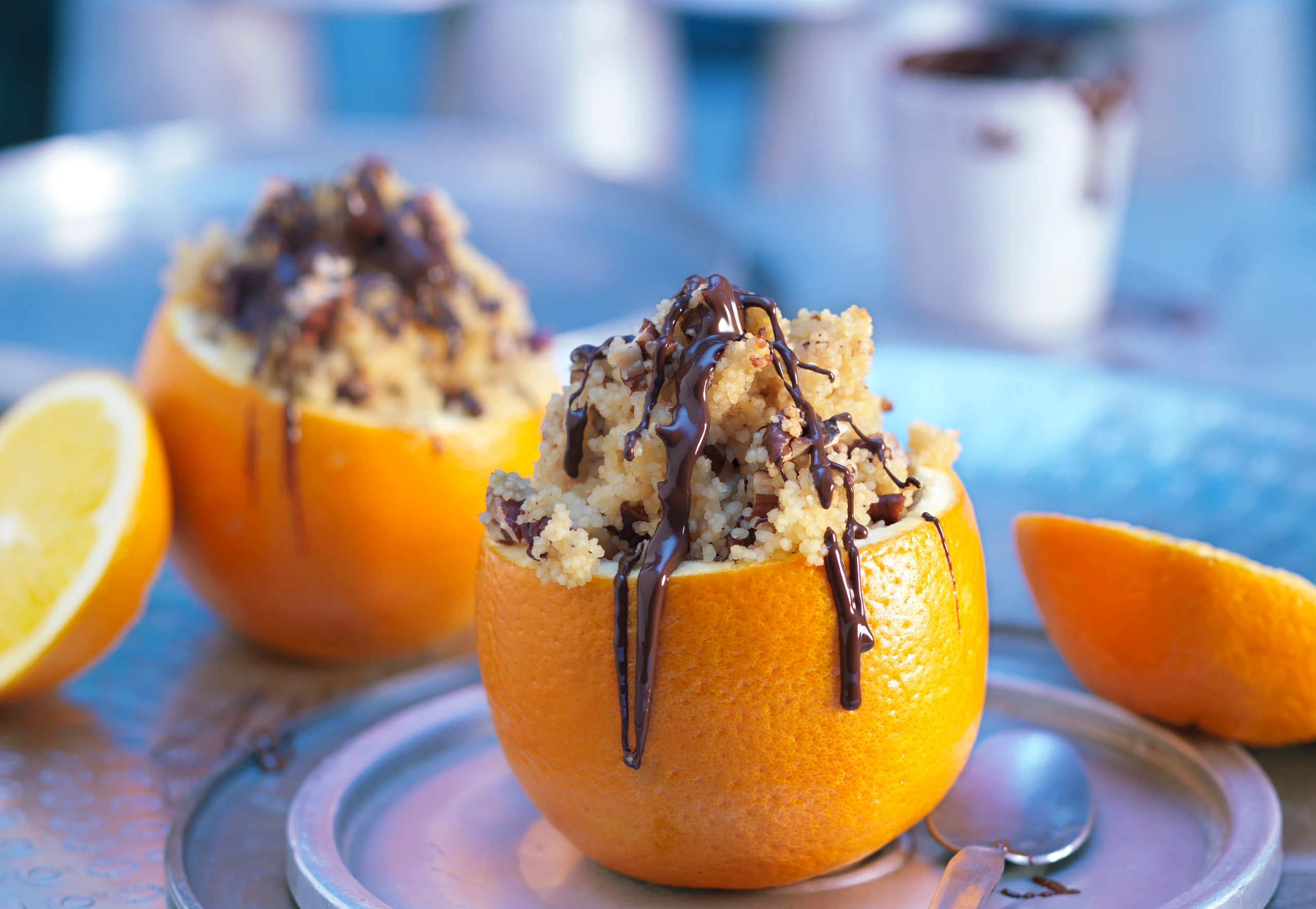 - Rohr auf 180°C vorheizen. Auflaufform mit Butter ausstreichen. Orangen mit der Couscousmischung füllen, in die Form geben und im Rohr (mittlere Schiene / Gitterrost) ca. 15 Minuten backen. Orangen anrichten und mit Kuvertüre garniert servieren. Die Orangenschale wird nicht mitgegessen.